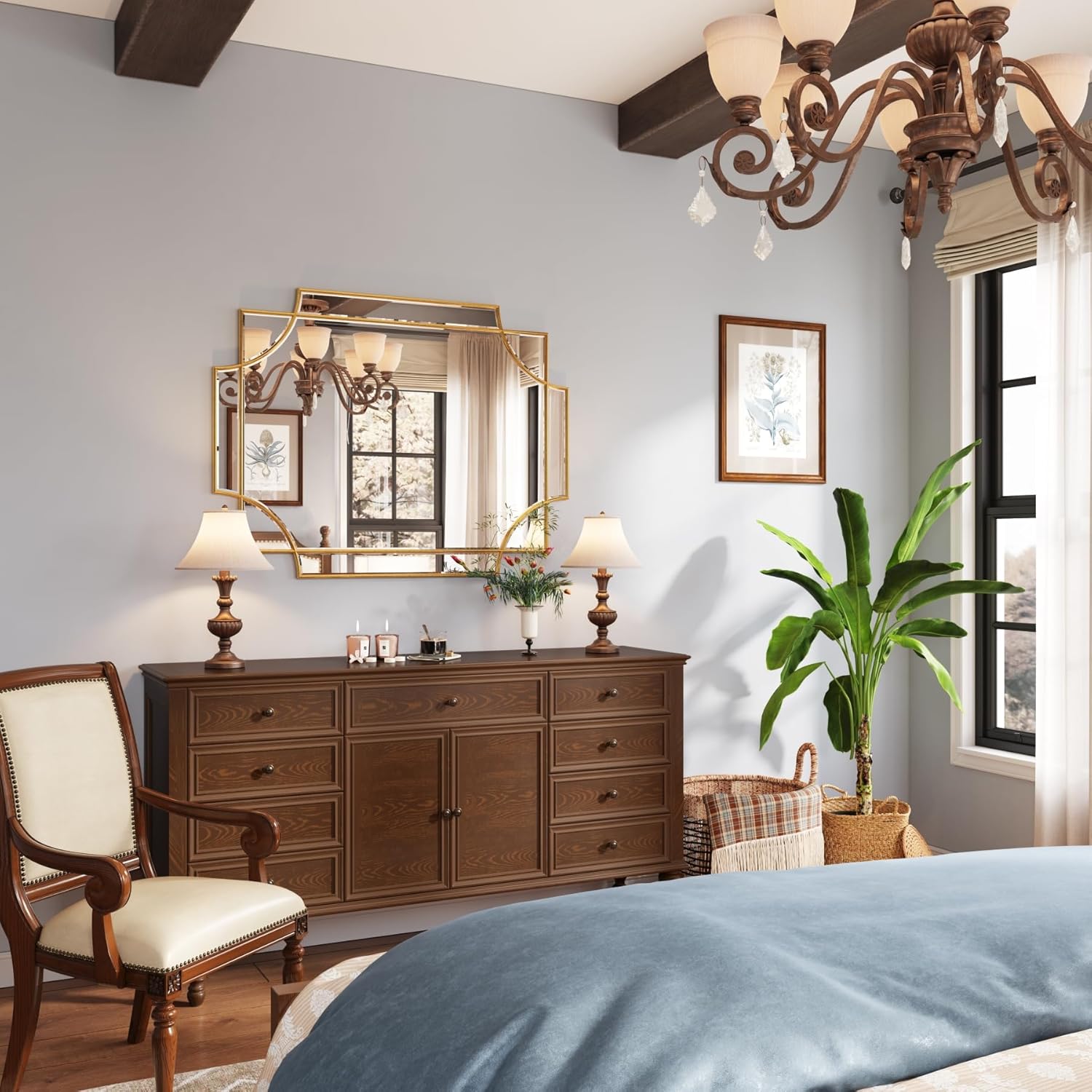 - UNTIQUE DESIGN. If your want some intricacies/interest to the pattern - not just a simple round or rectangle, this mirror will definitely be your perfect choice. Its sophisticated cutout corner accents along the inner and outer edges of the frame complete the look with added decorative detail. It will be a beautiful addition to any wall and an essential element in your home decor.
