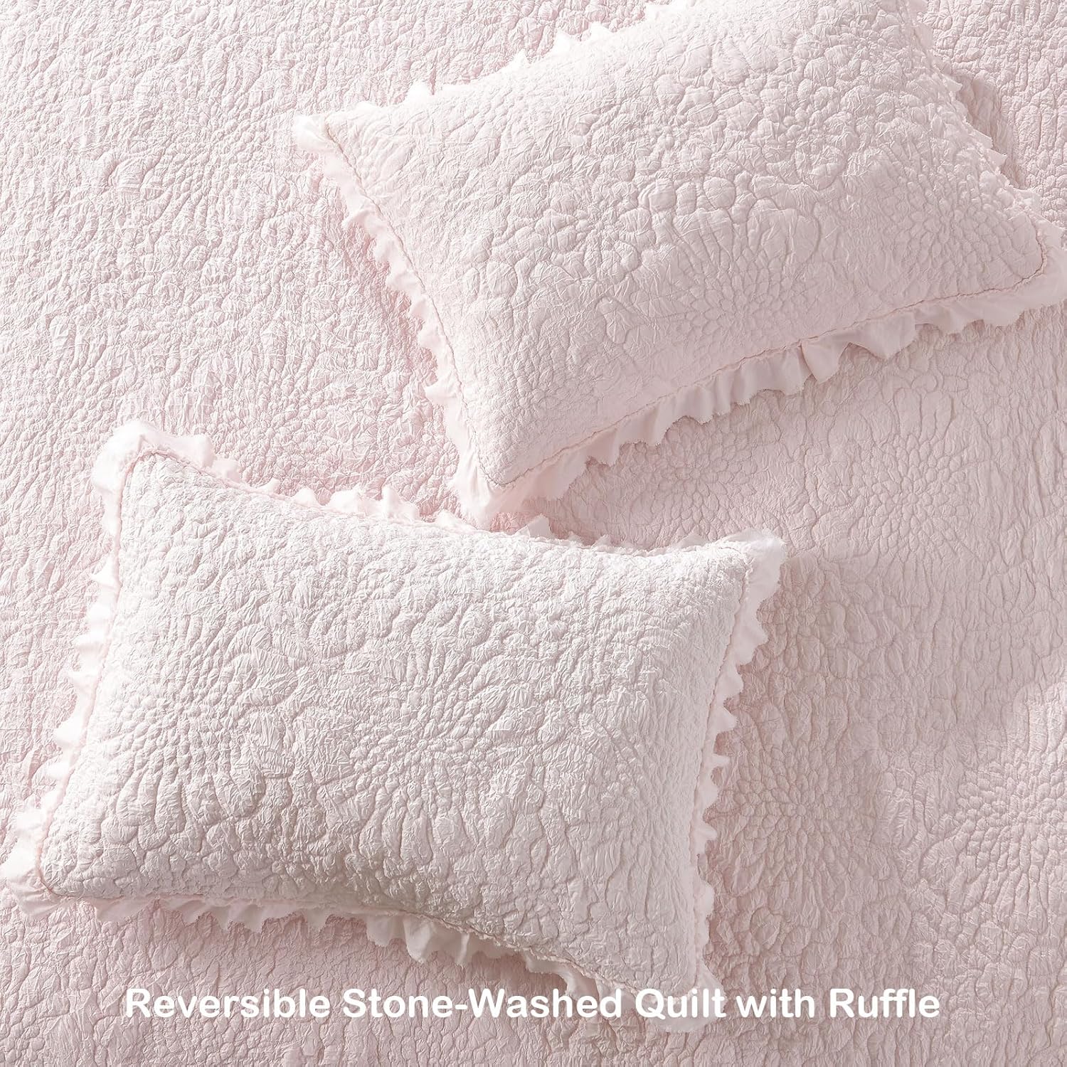 HORIMOTE HOME Pink Ruffled Quilt King Size, Stone-Washed Microfiber Lightweight Crinkled Farmhouse Rustic Shabby Chic Bedding Set, 3 Pieces Reversible Bedspread with Pillow Shams for All Season