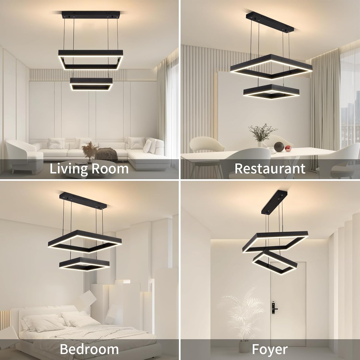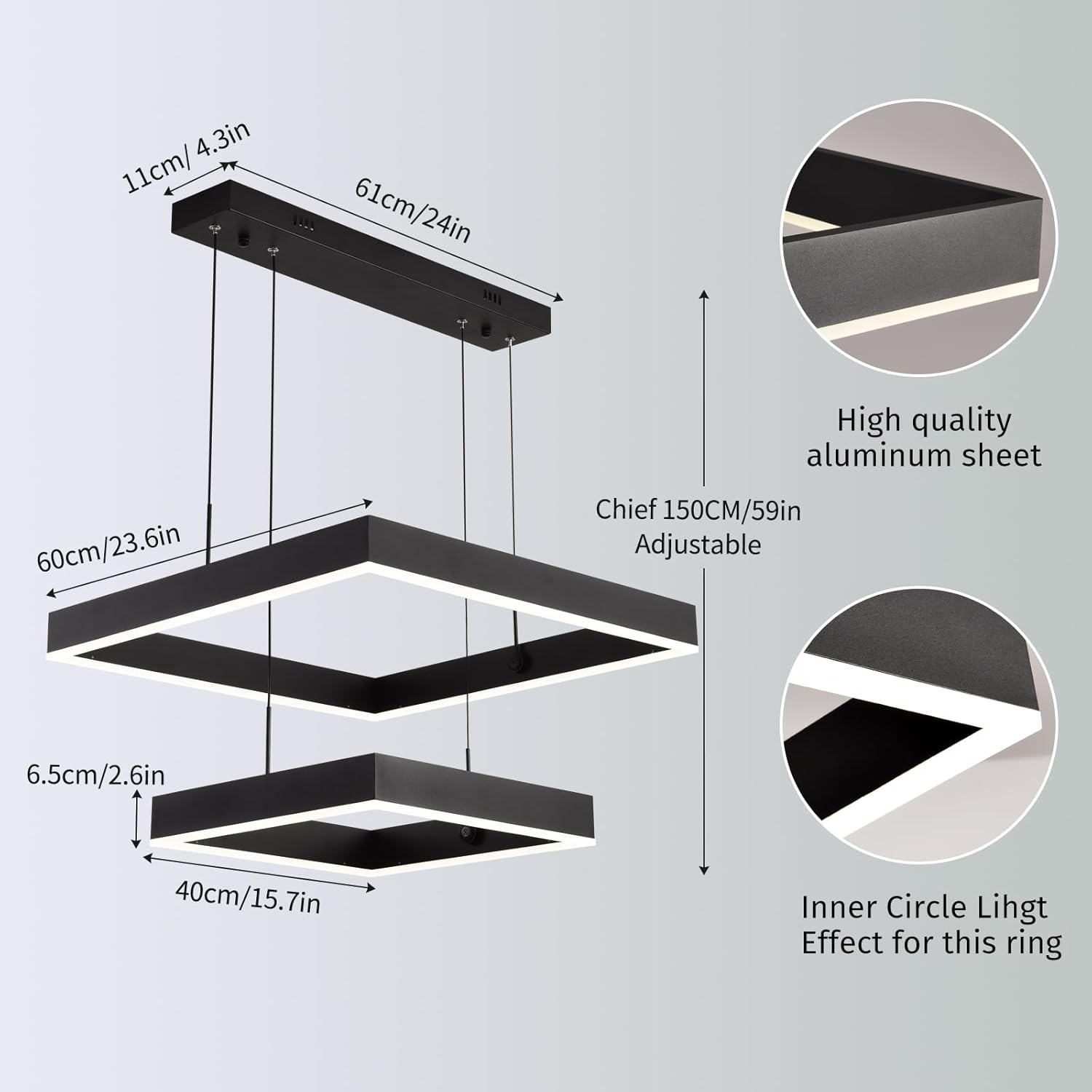 - 【Modern LED Chandelier Adjustable Height】: An Square LED chandelier will be the focal point of any room by serving as a decorative style element that enhances the beauty of fine furnishings. This modern chandeliers led ring chandelier made of high-quality metal + Acrylic, High light transmittance. Efficient LED light source, energy saving, soft light without glare. Pendant Lighting Size : 23.6”+15.7”(60cm+40cm), Maximum Hanging: Height Adjustable From 11.8"(300mm) to 59"(1500mm); Voltage: 110V