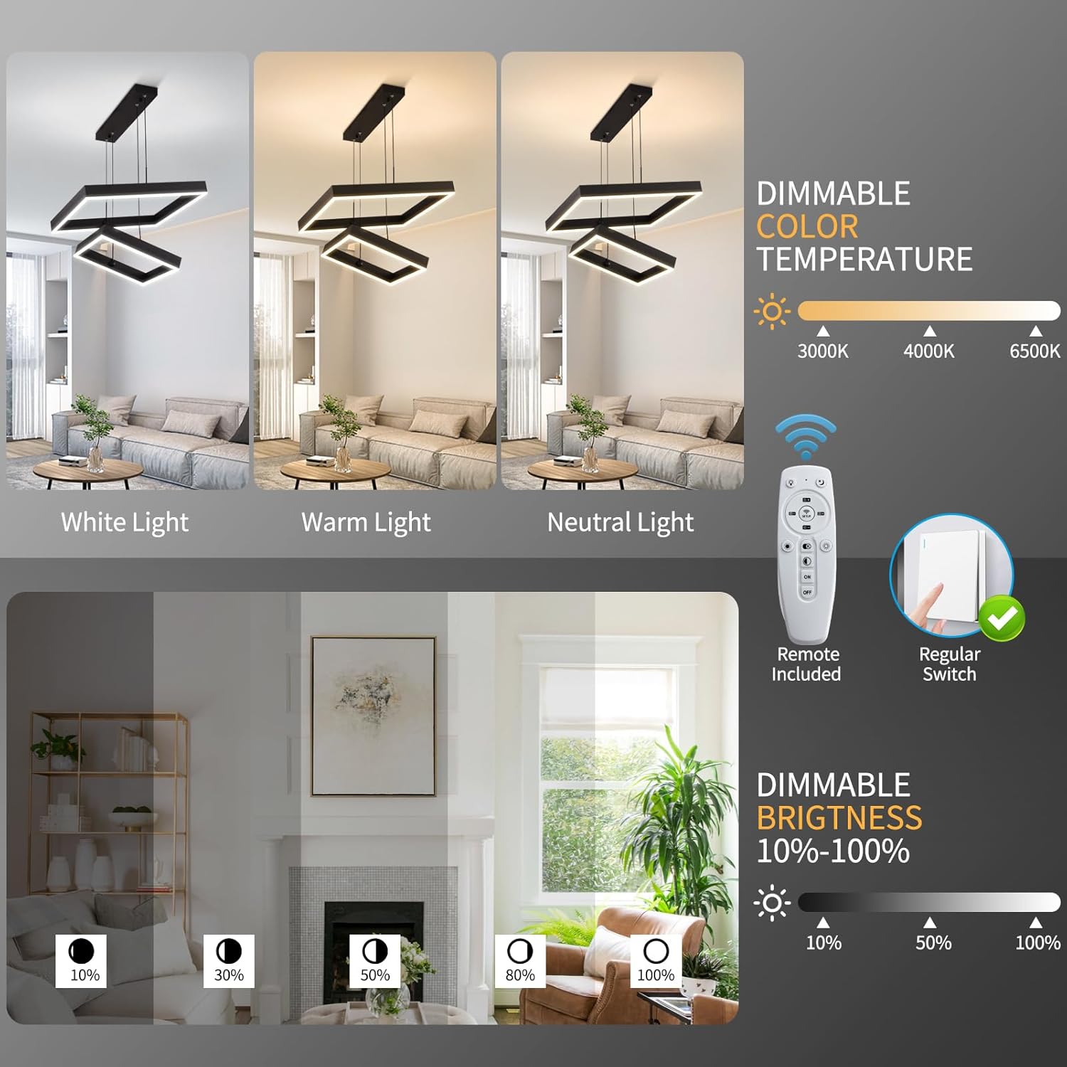 - 【Modern Chandelier Stepless Dimmable】: Black modern LED pendant light three-ring pendant light is dimmable, 3000K-4500K-6000K, three color temperatures: warm light, natural light, and cool light, let you have different lighting companies in the situation; modern The pendant light fixture has built-in LED light, with a service life of more than 50,000 working hours, and can also save a lot of electricity; modern black pendant light also has a unique feature - a night light, which gives your spac