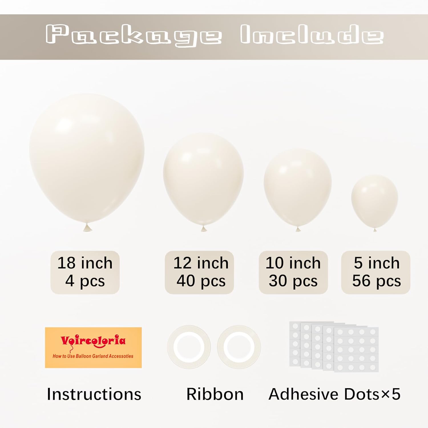 - Premium Material: Voircoloria different size sand white balloons are made of natural latex, durable and harmless, thicker and not easy to explode, you can inflate them with air or helium, both adults and children can use it safely, and stand well in the whole party, never worry about any problems with our cream white balloons