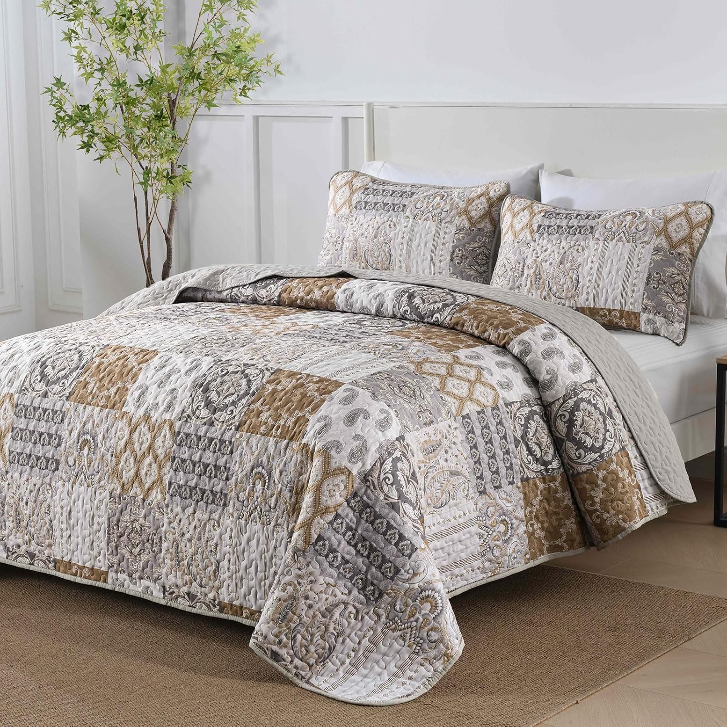 WONGS BEDDING Brown Quilt Set Queen Size, Patchwork Plaid Bedspread Bedding Sets Paisley Soft Microfiber Quilts for Queen Bed 3 Pieces Coverlet Set for All Season (96"x90")