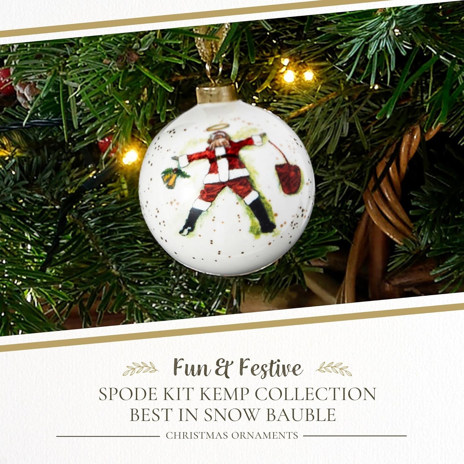 - Charming Whimsy: The Kit Kemp Best in Snow ornament features a delightful Santa making snow angels, adding a unique and playful touch to your Christmas tree ornaments, perfect for infusing your holiday decor with fun and festive spirit.