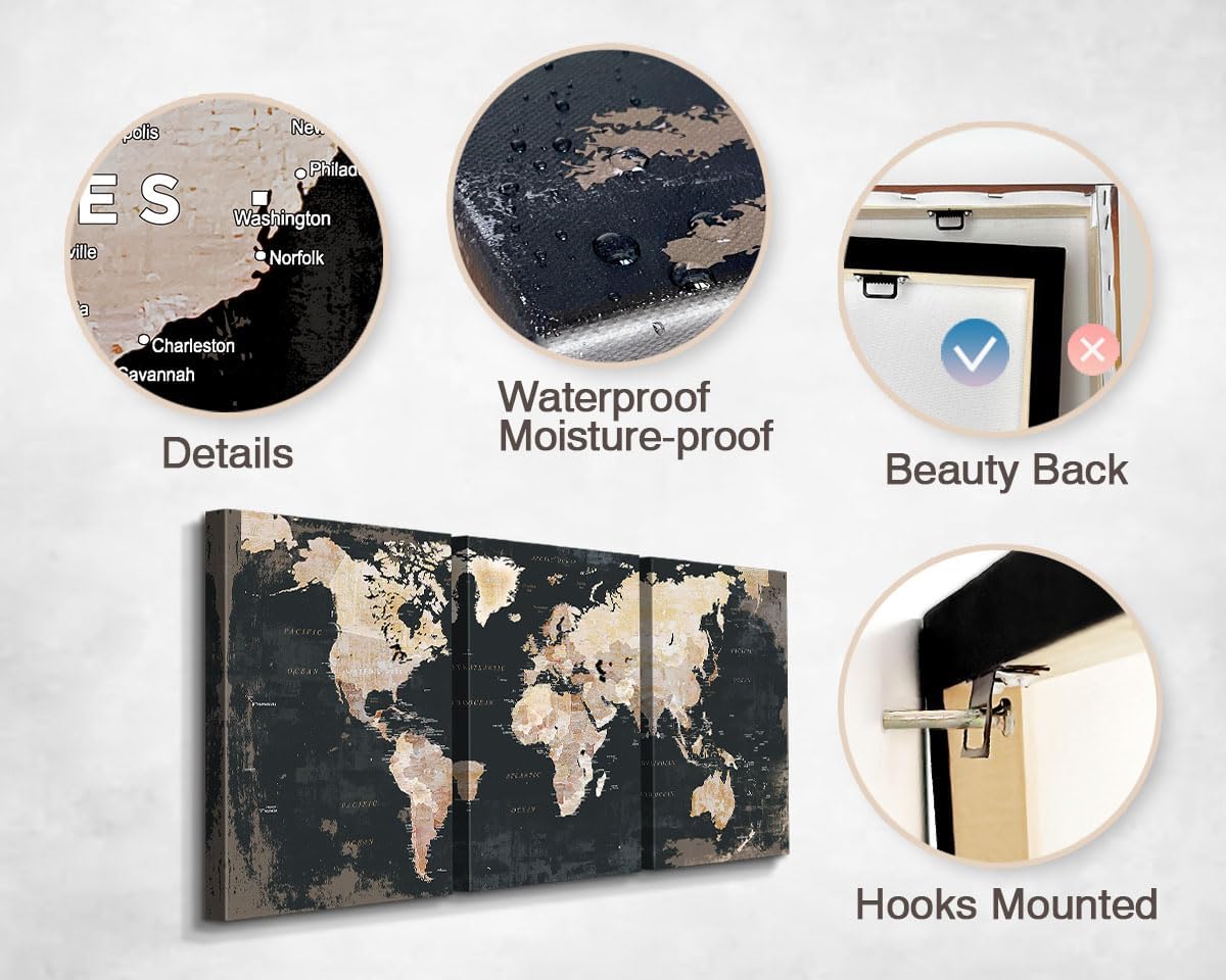 Office Wall Art for Living Room Bedroom Wall Decor Framed World Maps Black White Brown Pictures for Wall Decorations Vintage Decor