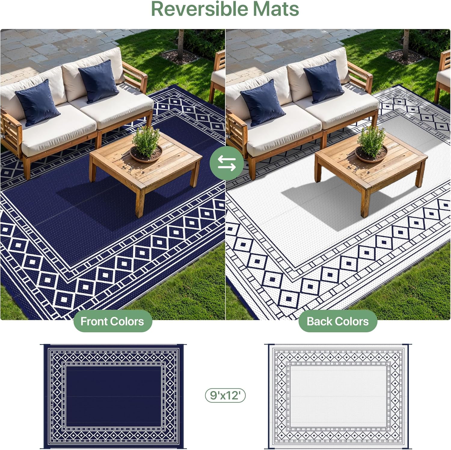 GENIMO Outdoor Rug Waterproof for Patio Decor, 9'x12' Foldable Reversible Plastic Straw Carpet for Travel Trailers, Outside Area Mat for Rv, Deck, Picnic, Porch, Camper, Balcony, Beach, Blue & White