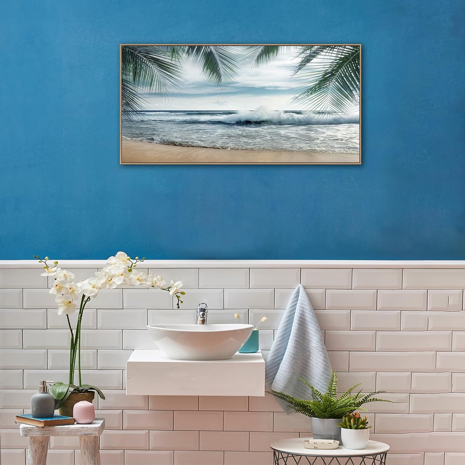 - Oceanic Retreat: Elevate your decor with this Beach Canvas Wall Art, perfect for ocean-themed decor enthusiasts. With its vivid depiction of waves, blue skies, and palm tree leaves, it transforms your space into a coastal haven, inviting you to embrace the serenity of the seaside