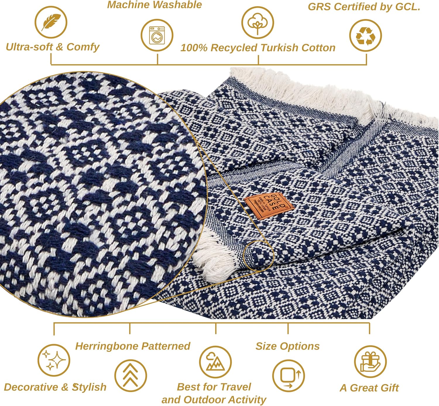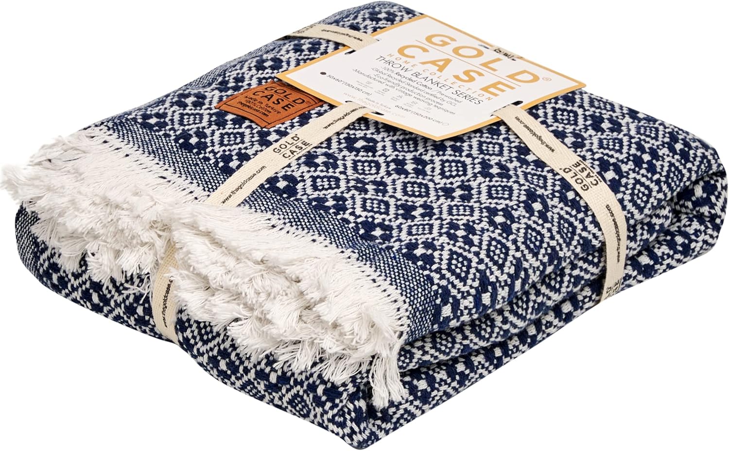 Gold Case Throw Blanket for Couch - 100% Recycled Turkish Cotton Blankets & Throws - Retro Soft Throw Blankets for Living Room Sofa - Boho Decorative Woven Throws for Couch - 60x80 - Navy Blue