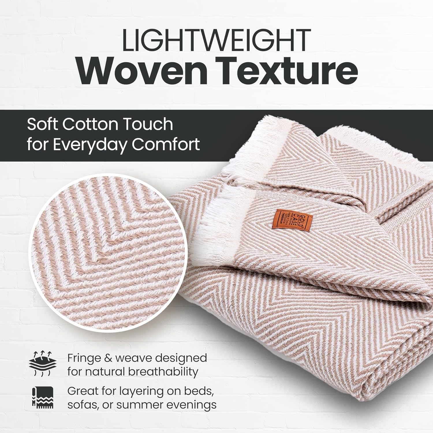 Gold Case Throw Blanket for Couch – 100% Recycled Turkish Cotton Blankets & Throws – Elegant Decorative Throw Blankets for Living Room Sofa – Woven Throws for Couch – Elegant Beige – 60x80