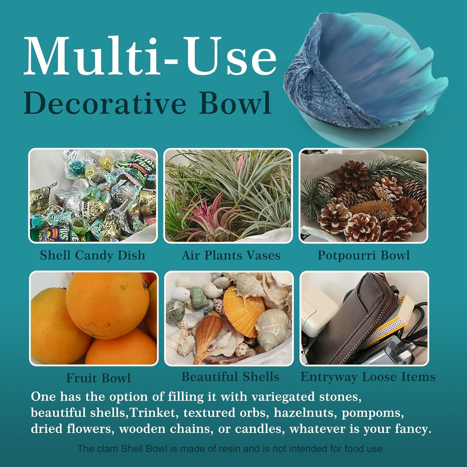 - 【Decorative Bowls for Home Decor】The large Blue clam shell shape decorative bowl design is the present of the nature,Though Faux, this shell looks real of a ocean weathered shell and is very suitable for use as aKey Bowl for Entry Table,Beach Theme Candy bowl,Fruit Bowl for Kitchen