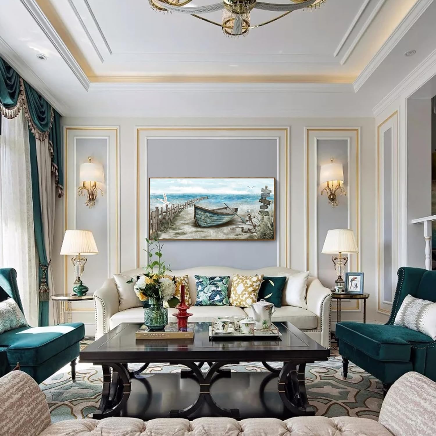 - Calming Seashore Aesthetic: This serene large framed wall art captures sea bird resting on the rowboat. Behind the boat is blue ocean with the soaring seagulls. The nautical palette of blues, sand beige, tan, and fluffy white clouds provide a soothing feel. Hang this beach themed framed wall art up for a calming vibe, and escape to the beach each day after work in the comfort of your home.