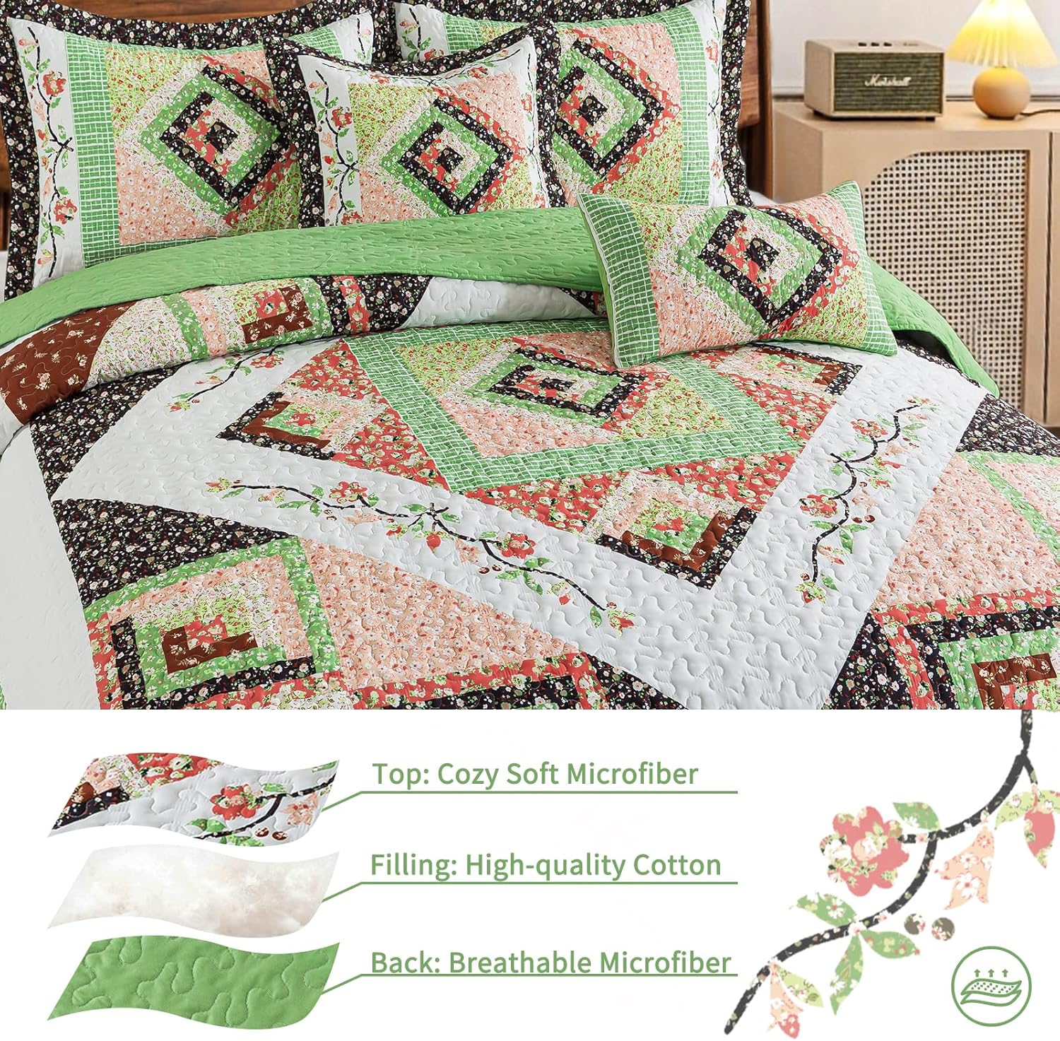 - 【Garden style】 Quilts queen size features geometric and floral patterns, combined with green elements, creating a comfortable and fresh natural atmosphere for your bedroom. The soft and comfortable cotton filling allows you to enjoy every peaceful and comfortable night.