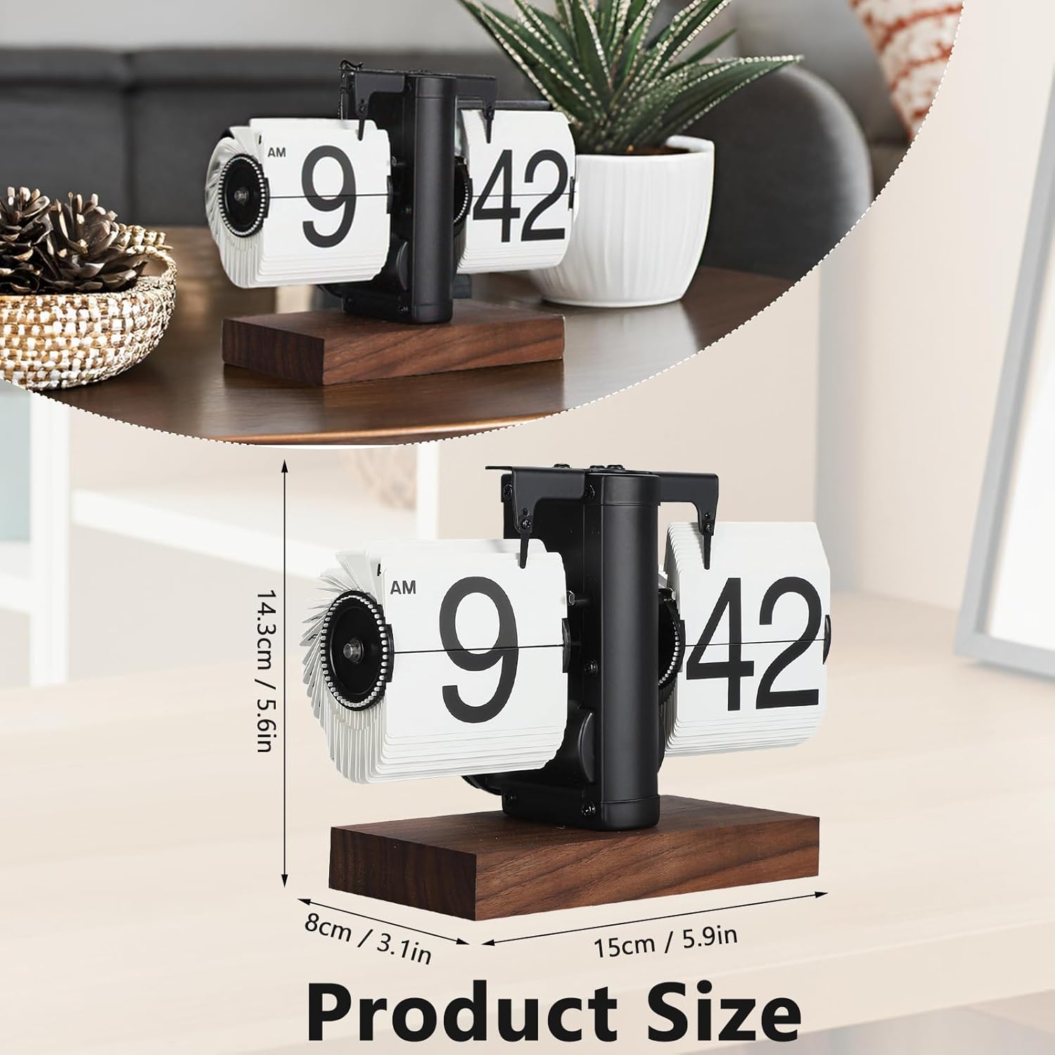 Flip Desk Clock, Retro Vintage Flip Desk Table Clock, Digital Sided Large Numbers Mechanical Flip Clock Wood Base for Living Room, Study Room and Office(Black)