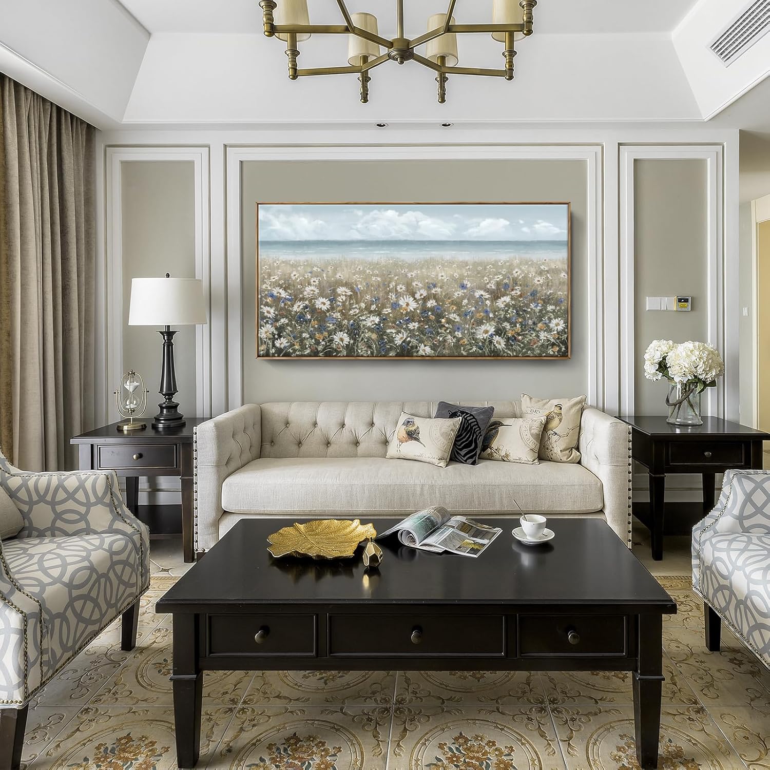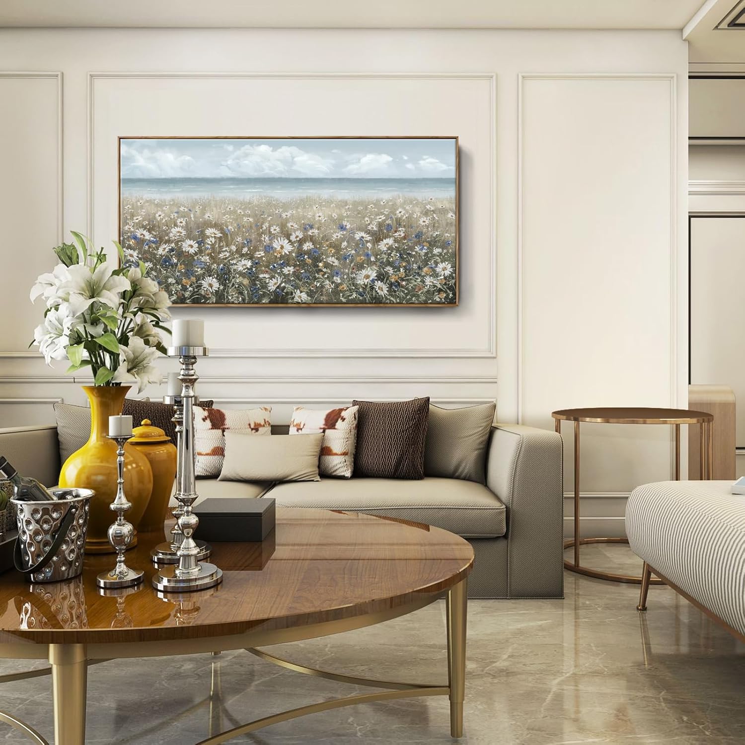 - ➤Bring a Beach Vibe to Your Space: This large floral wall art depicts a seashore covered with newly blooming wildflowers Daisy. The upper half of the canvas wall art features a blue sky and a calm ocean in pale blue and gray tones for a fresh and breezy look. The lower half of the artwork is covered in a neutral palette of white, cream, and brown to complete this coastal farmhouse piece.