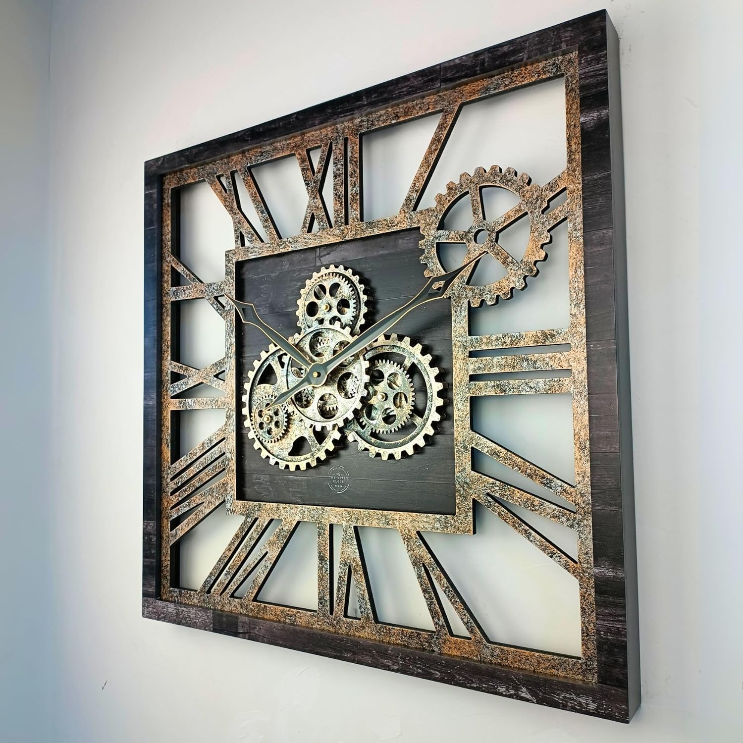 The Gears Clock 24'' Inch Square Real Moving Gear Wall Clock Vintage Industrial Oversized Rustic Farmhouse (Vintage Black)