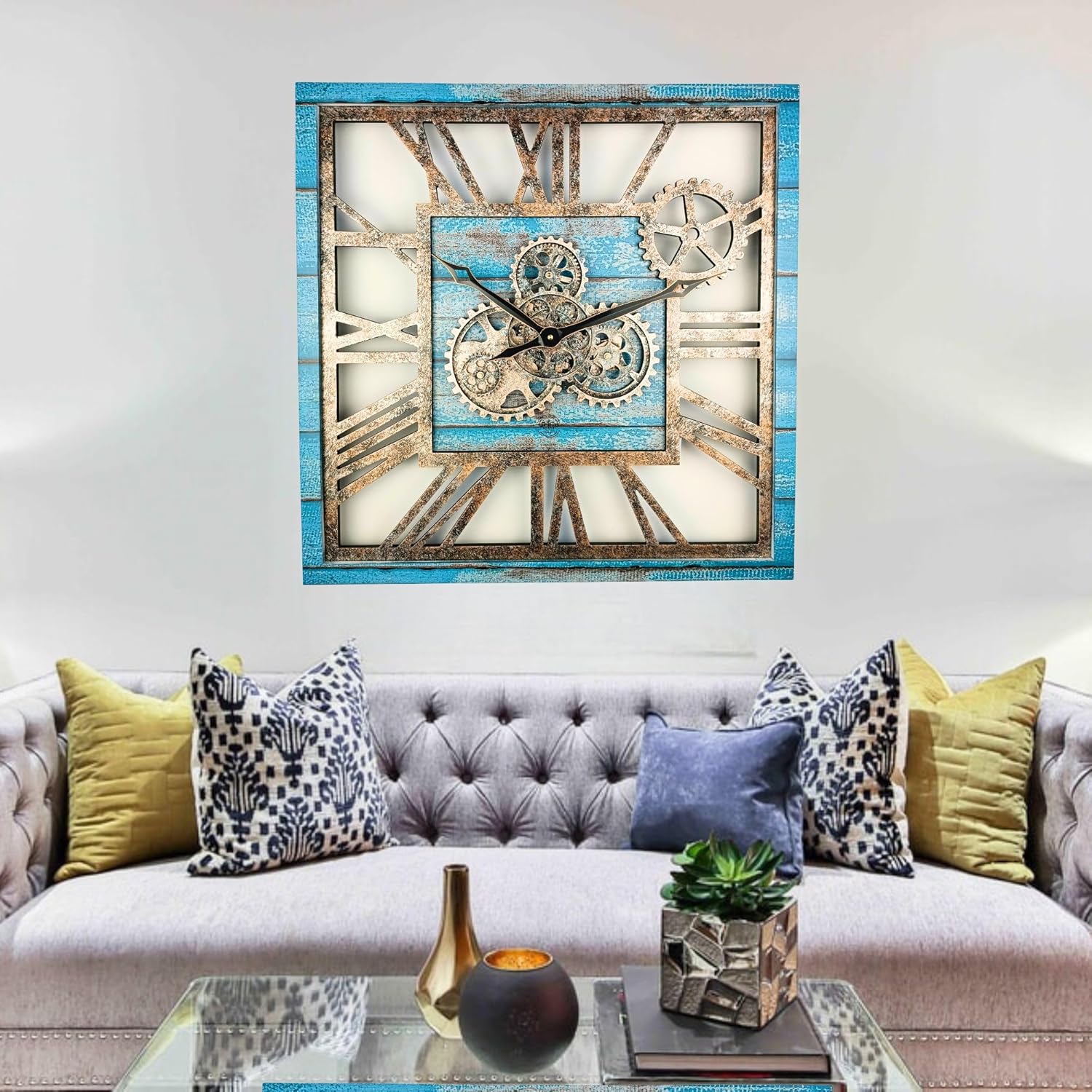 The Gears Clock 24'' Inch Square Real Moving Gear Wall Clock Vintage Industrial Oversized Rustic Farmhouse (Ocean Blue)