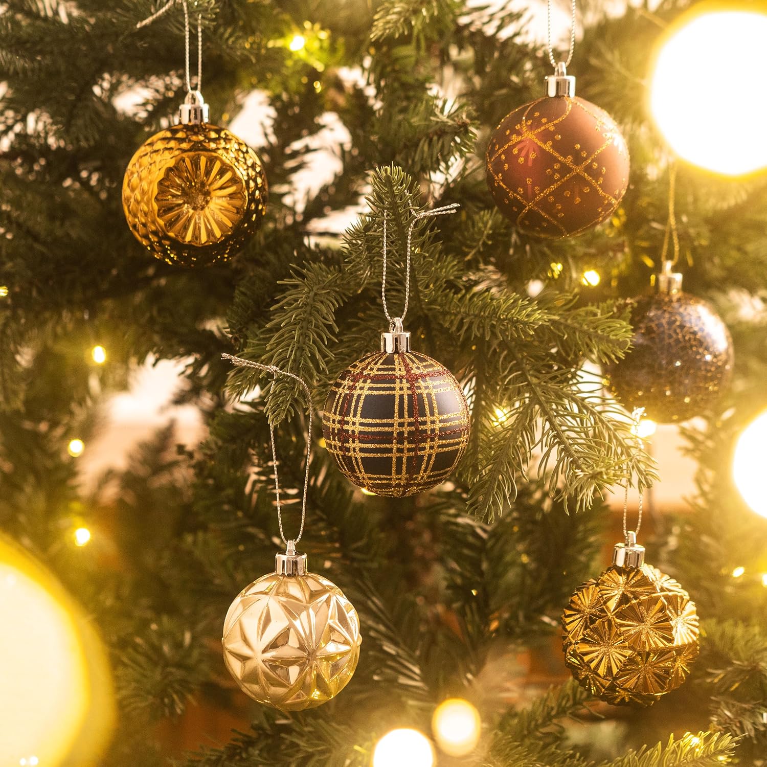 - 【Variety of Patterns and Molds】 This christmas set includes a variety of tree ornaments, featuring balls in different patterns and shapes such as snowflake painting, plaid, octagonal star, reflector ball. The diverse patterns complement each other well, adding interest and charm to your overall decor