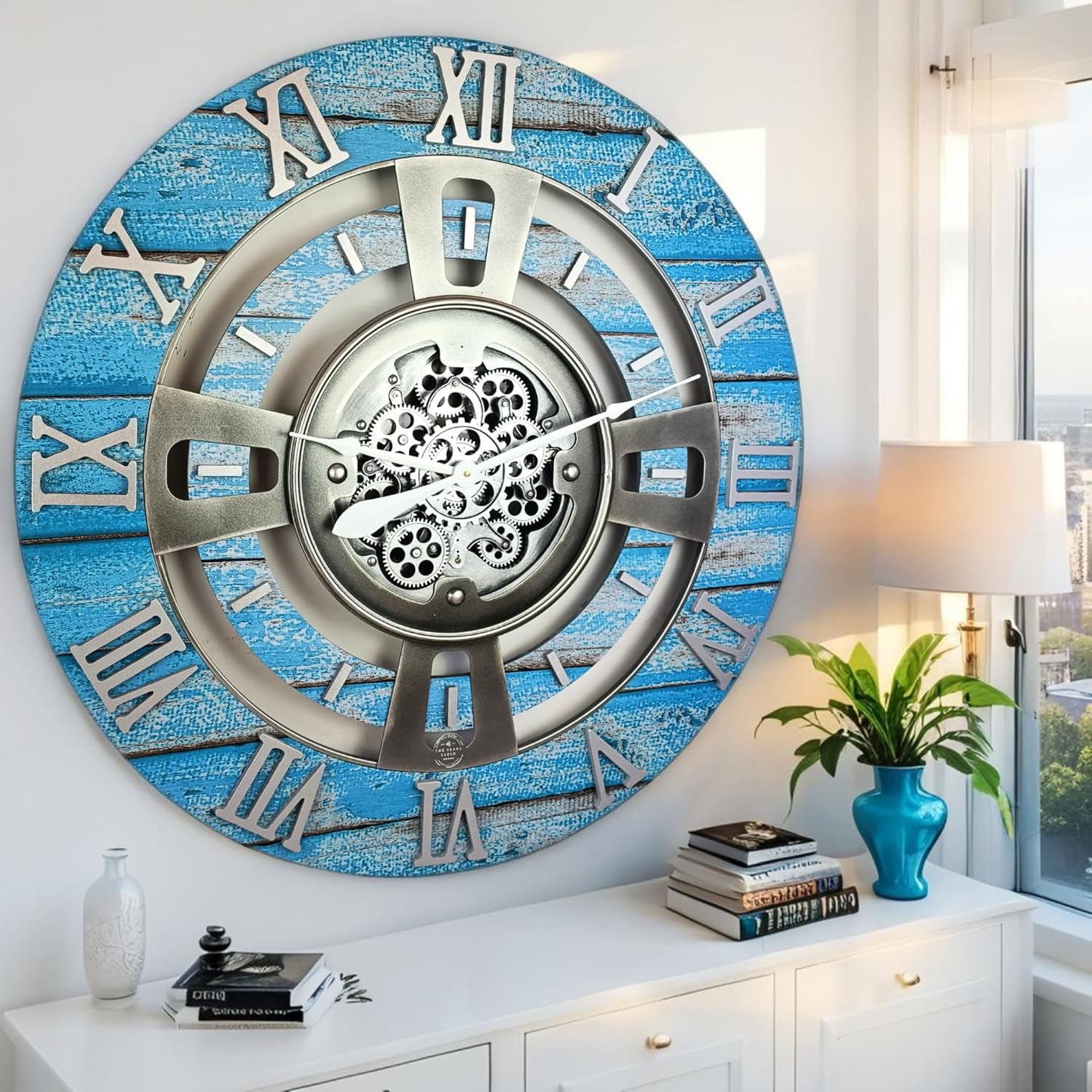 The Gears Clock Real Moving Gear Wall Clock England Line (Ocean Blue, 36 inches (90 cm))