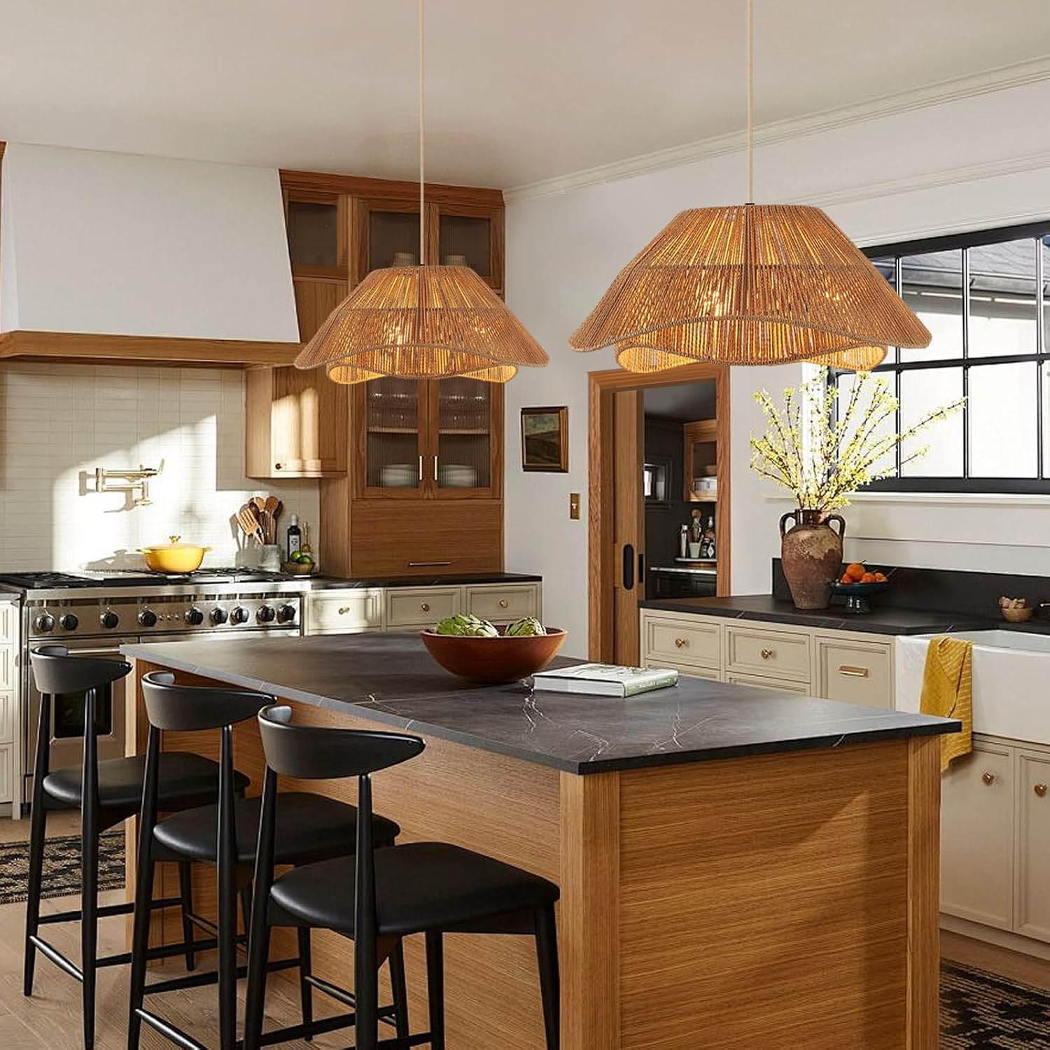 - 【Unique 2-layer Rattan Design】The boho pendant lights kitchen island is made of the hand woven natural rattan and durable metal to be a bohemian look. The double irregular design casting petal-shaped shadows on the ceiling, adding a warm and inviting atmosphere.
