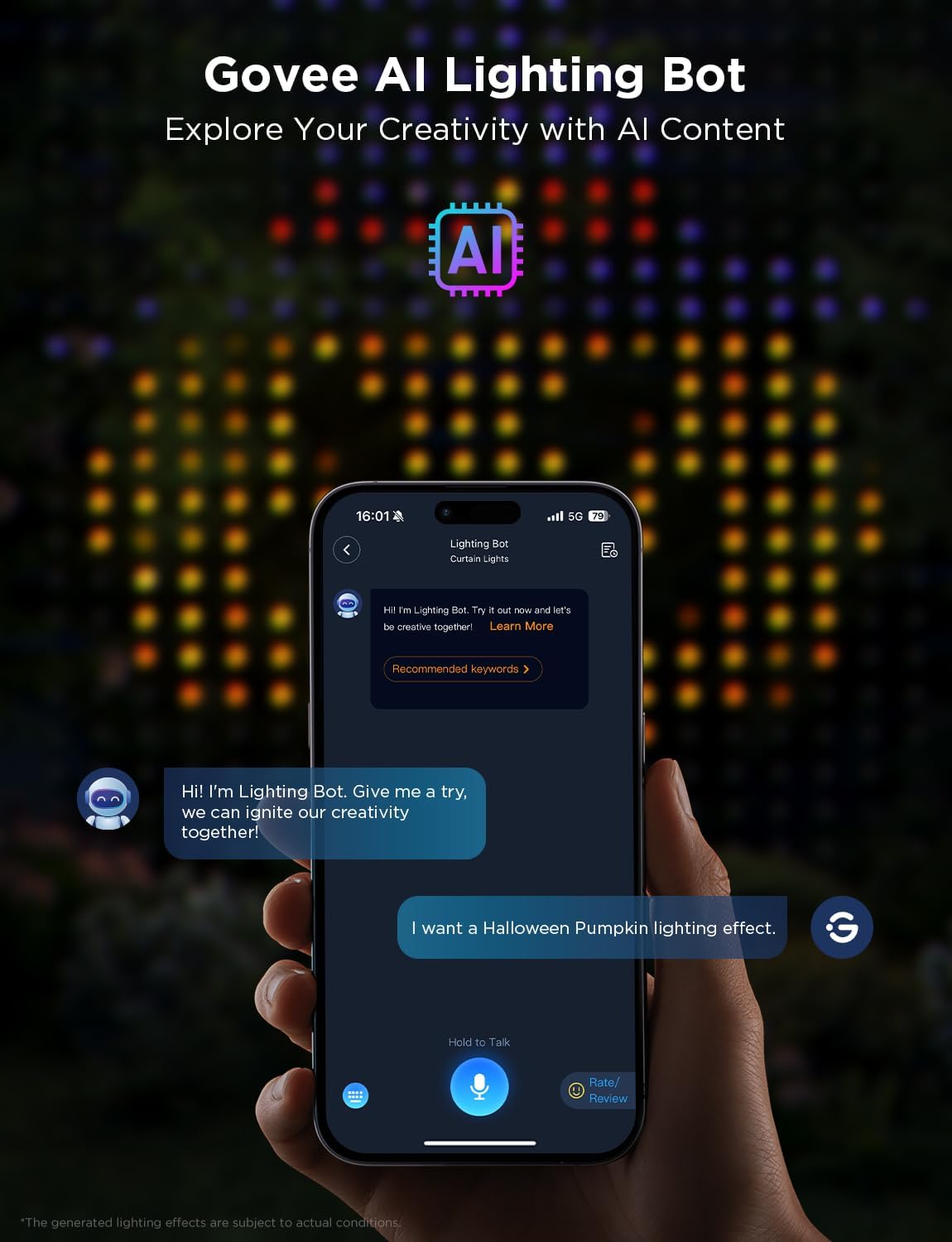 - Govee AI Lighting Bot: Enhance your creativity with the unshackled power of Govee AI Lighting Bot. Breath life into designs using AIGC, with both text and voice prompts, providing JPG lighting effects.