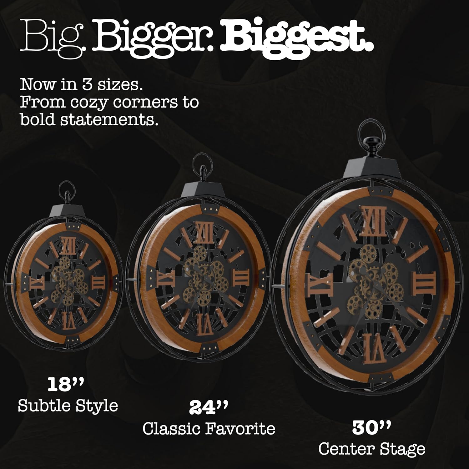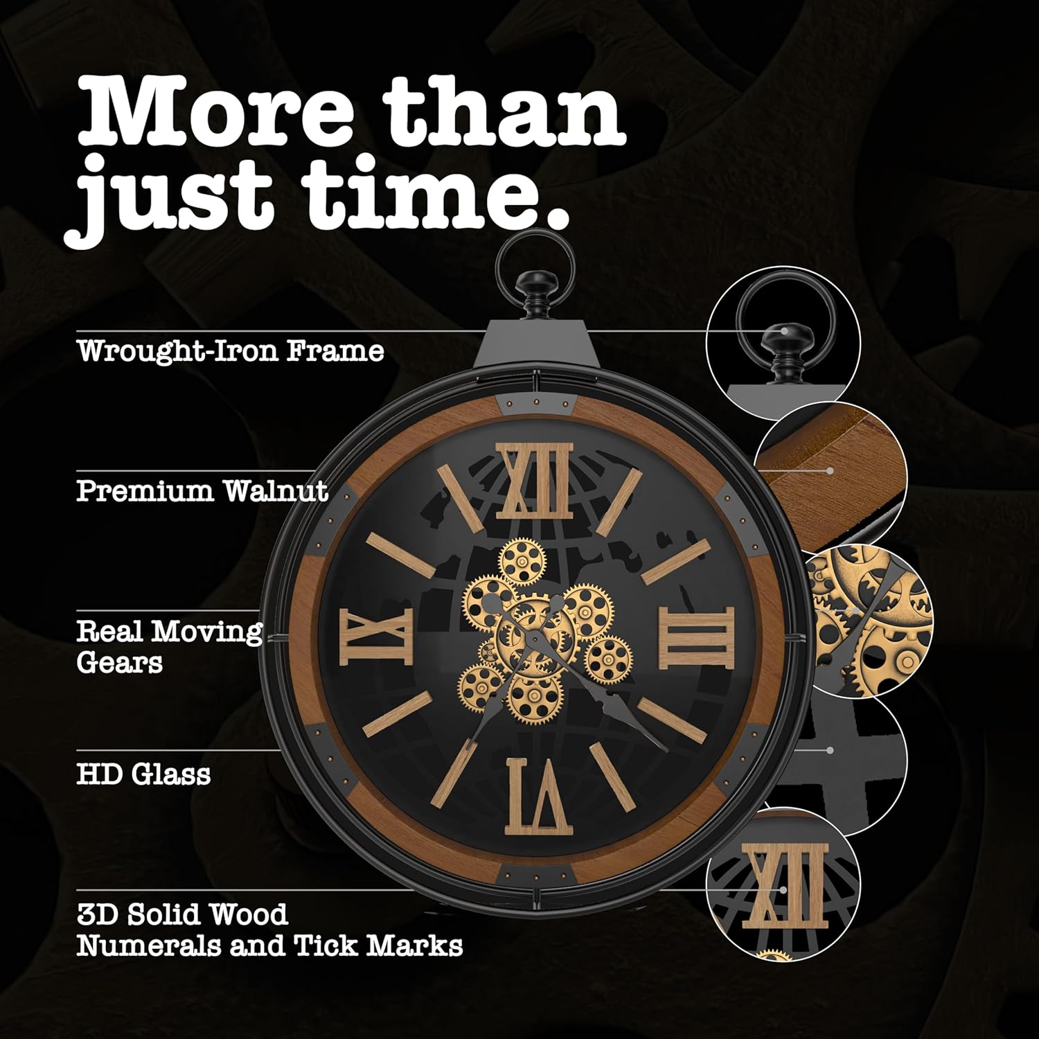 - TIMELESS STYLE: Stay on schedule with your new Driini Large Rustic Wall Clock. This oversized, 30 inch moving gear wall clock features a premium wooden frame, and a decorative black wrought-iron skeleton. The clock face is protected by a HD tempered glass for clear visibility and durability. A big, looped handle on top adds to its aesthetic as an industrial steampunk clock or gothic clock, while also invoking nautical and farmhouse vibes. Hand-cut 3D solid wood Roman numerals and tick marks are individually mounted to ensure visibility from any angle.