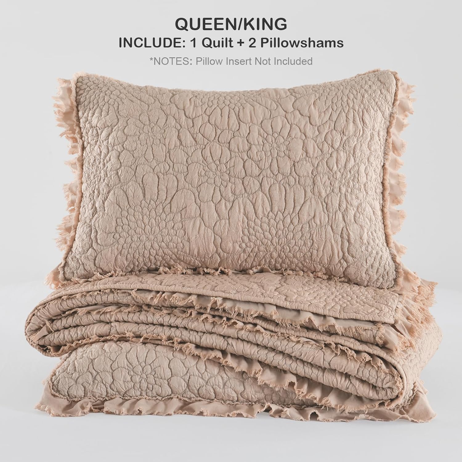- Elegance Flower Design with Ruffled Edges: This floral stitching reversible quilt, flower quilted pattern on front and back. Added Ruffled Fringe both on bedding set and shams, makes your room stylish and fashion look.