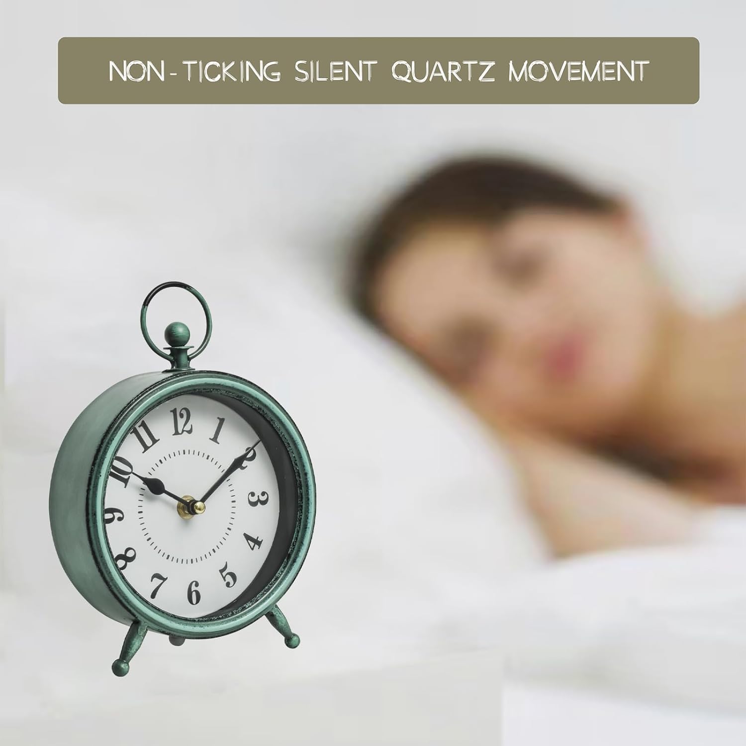 Vintage Small Rustic Green Table Clock on Stand - Decorative Desk and Shelf Clock, Battery Operated, Silent Non-Ticking Timepiece Perfect for Office, Living Room, and Bedroom Decor