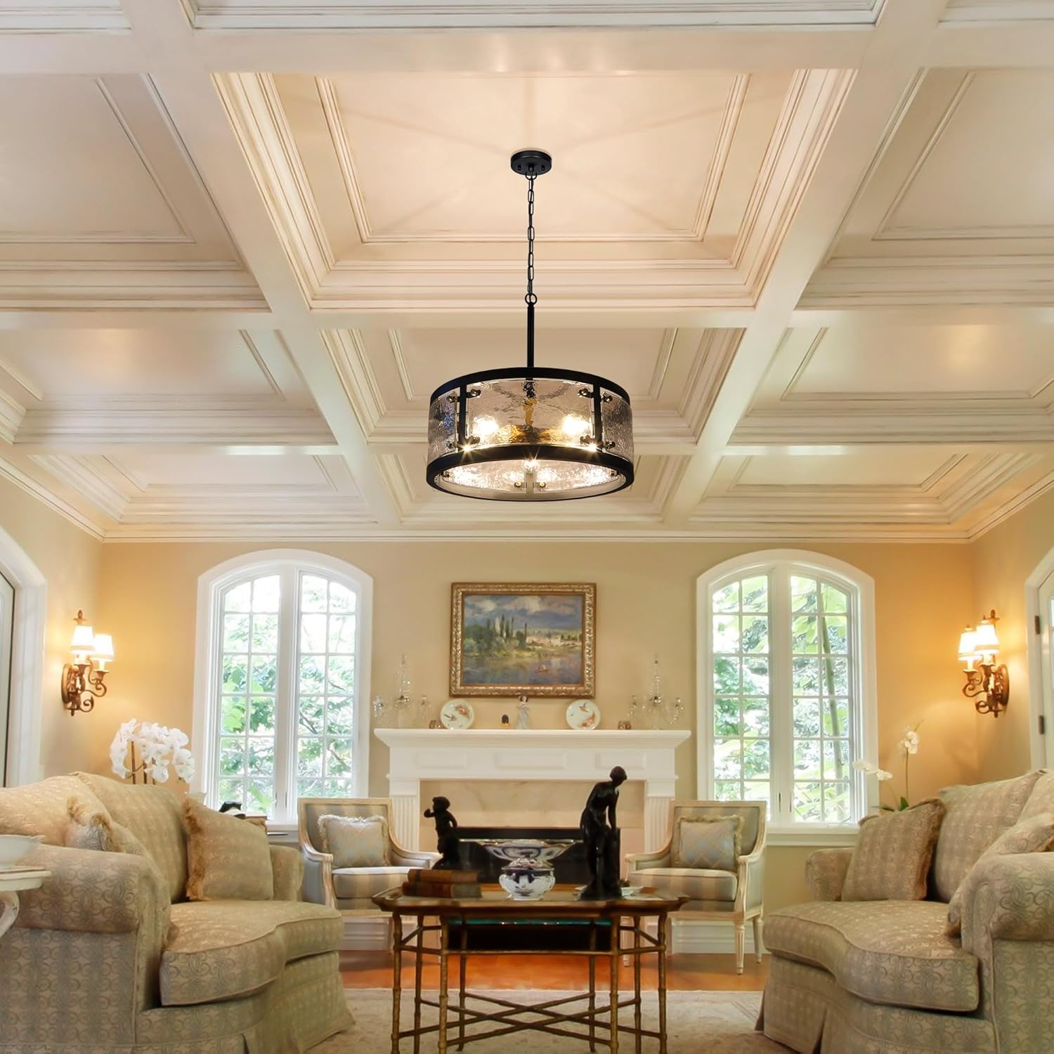 - Design: Drum chandelier is meticulously crafted by highly skilled craftsmen. The black metal frame is combined with clear waterglass to create a unique texture and depth. Gold accents add a touch of luxury, while the overall circular design provides an even and welcoming lighting effect. The clear waterglass will produce a unique light and shadow effect when the light penetrates, adding a unique charm to the interior.