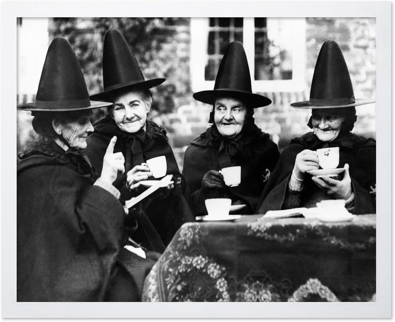 Poster Master Classic Photograph Poster - Vintage Halloween Print - Gift for Artist, Friend - Witches Tea Party, Old Women Smiling, Wearing Robes - Wall Decor for Living Room, 11x14 White Framed
