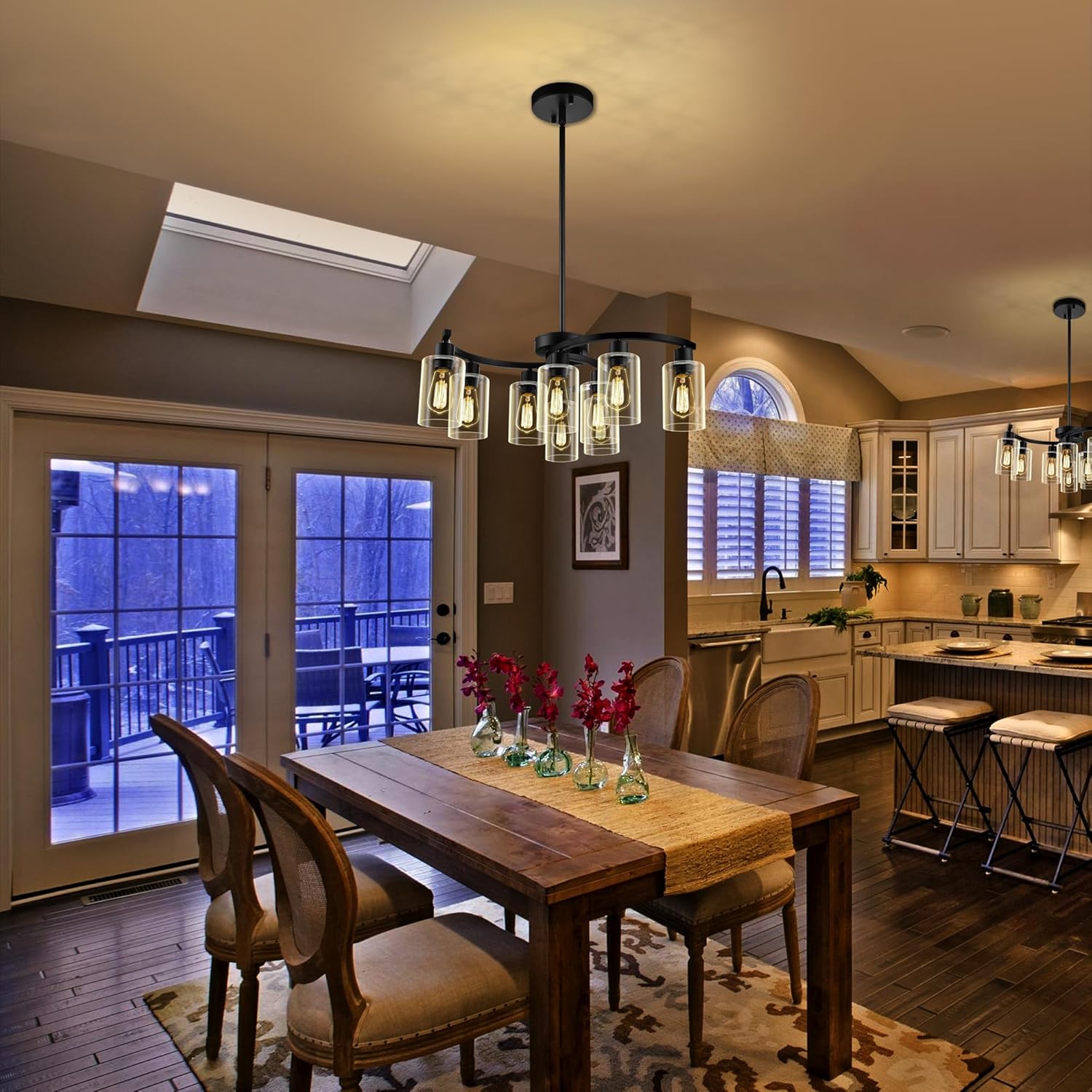 9-Light Black Modern Chandeliers for Dining Room, Adjustable Height Farmhouse Kitchen Island Lighting, Industrial Hanging Light Fixtures for Living Room Bedroom, Clear Glass Shade