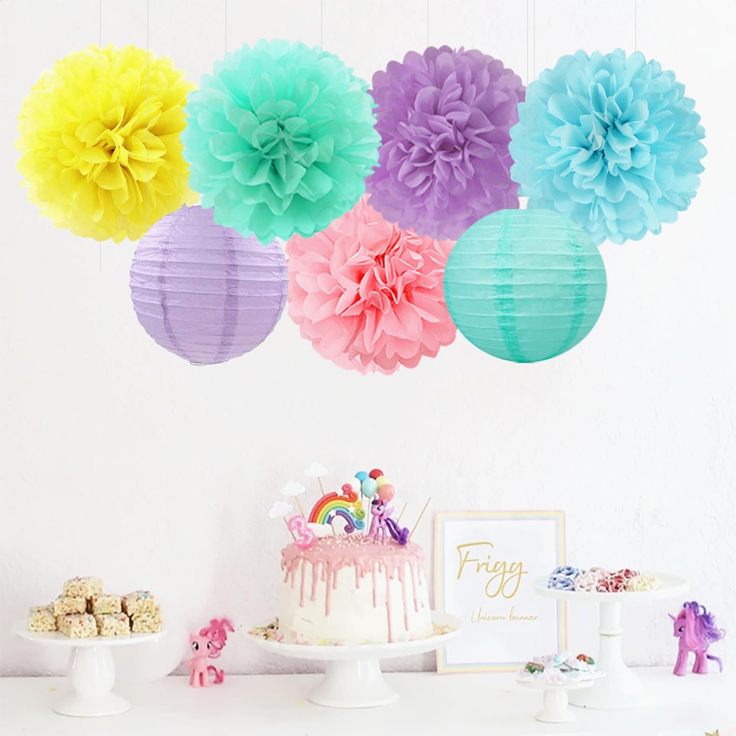- 【Pastel Rainbow Party Decorations Kit Includes】The party decorations kits include 9pcs tissue paper flowers: 6pcs 10" and 3pcs 8" in purple blue peach yellow pink mint color, 6pcs 8inch paper lanterns.