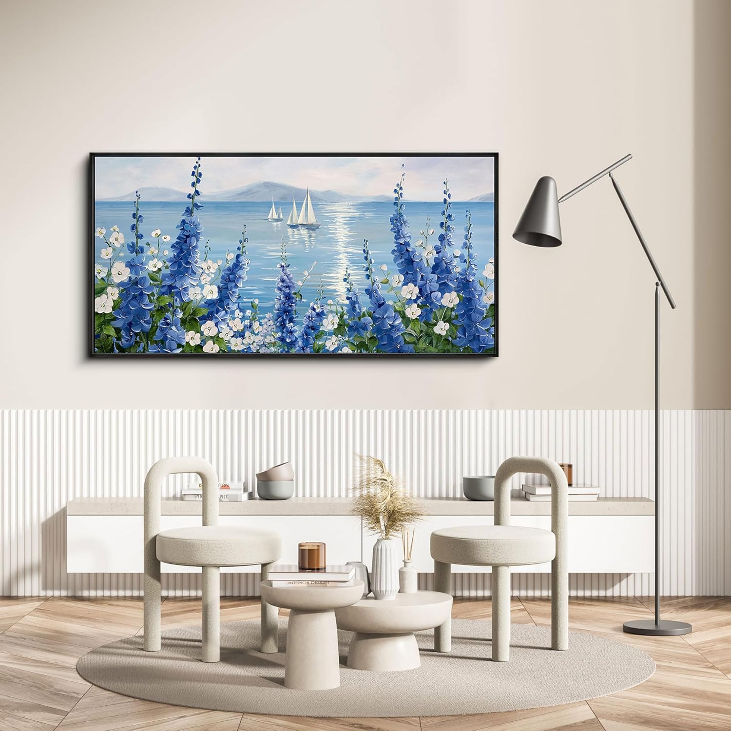 XLSJERST Sailboat Wall Art - Blue Canvas Abstract Painting Textured Picture Artwork Vintage Nautical Flower Painting Coastal Modern Print 20"x40" Frame for Living Room Bedroom Office Home Decoration