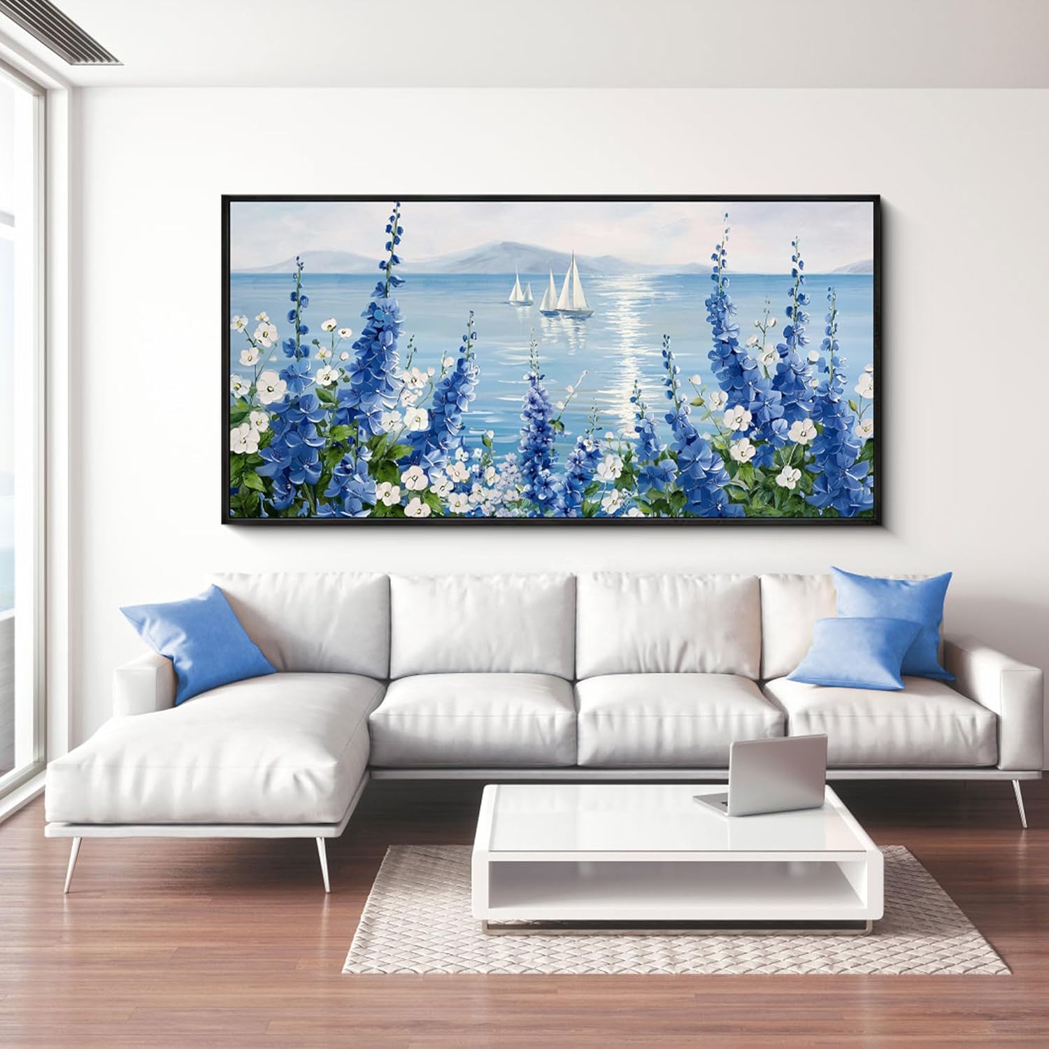 XLSJERST Large Sailboat Wall Art - Blue Canvas Abstract Painting Textured Picture Artwork Vintage Nautical Flower Painting Coastal Modern Print 29"x58" Frame for Living Room Bedroom Home Decoration