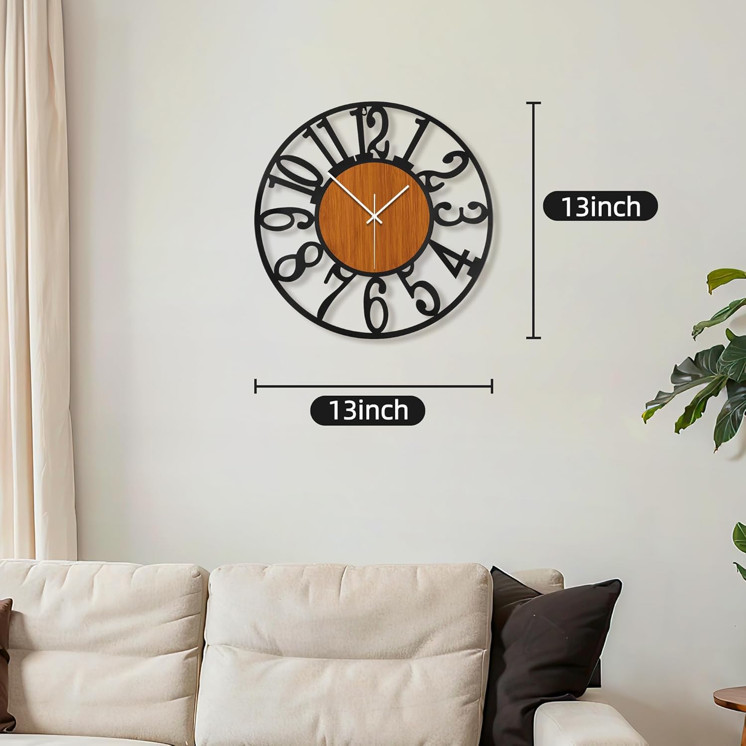 Maxstar Round Wall Clock for Living Room Decor Battery Operated Non Ticking Black Metal Wood Clocks for Home Living Room Garden Office Kitchen Decoration -13 inch