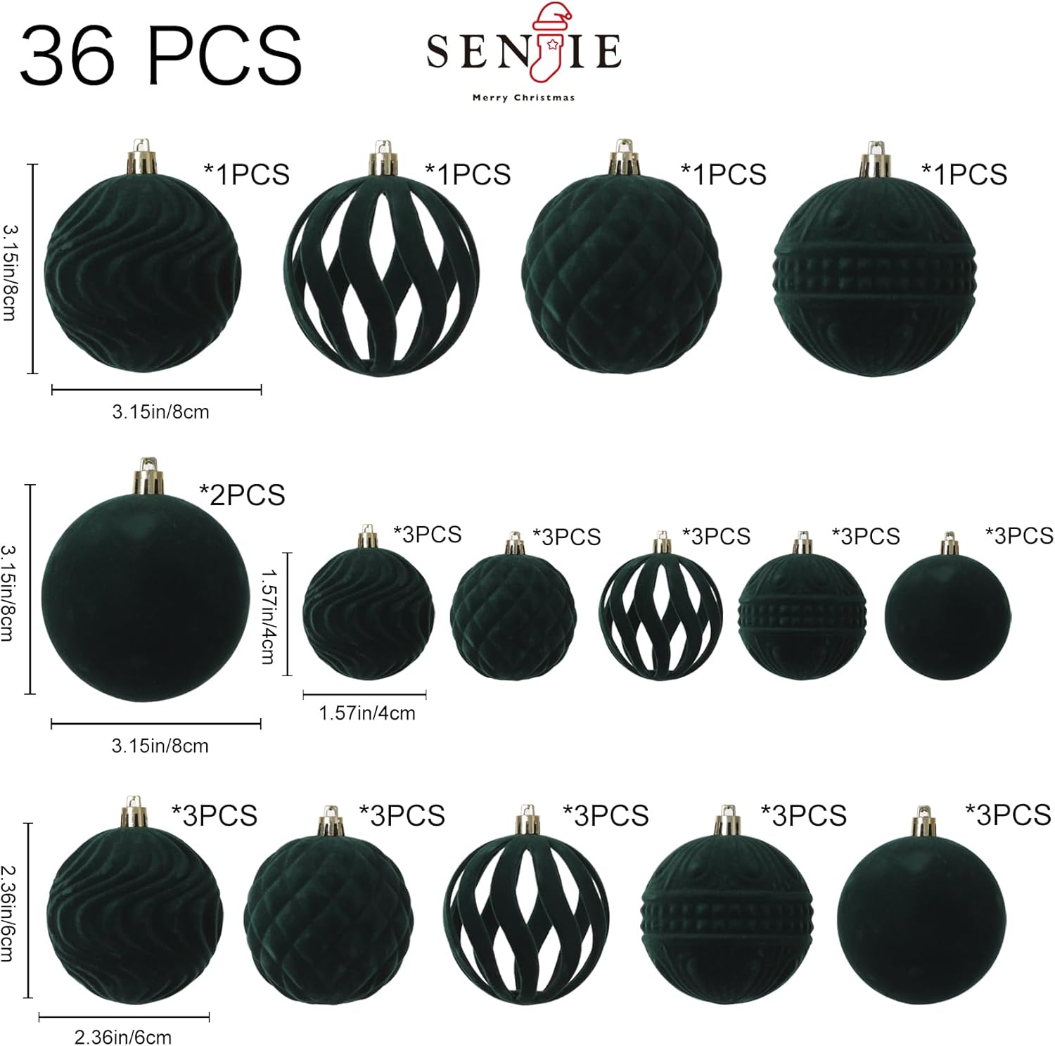 Senjie 2025 Velvet Christmas Ball Ornaments Sets 36pcs Flocked Christmas Ornaments Assortment Decor for Xmas Deep Green
