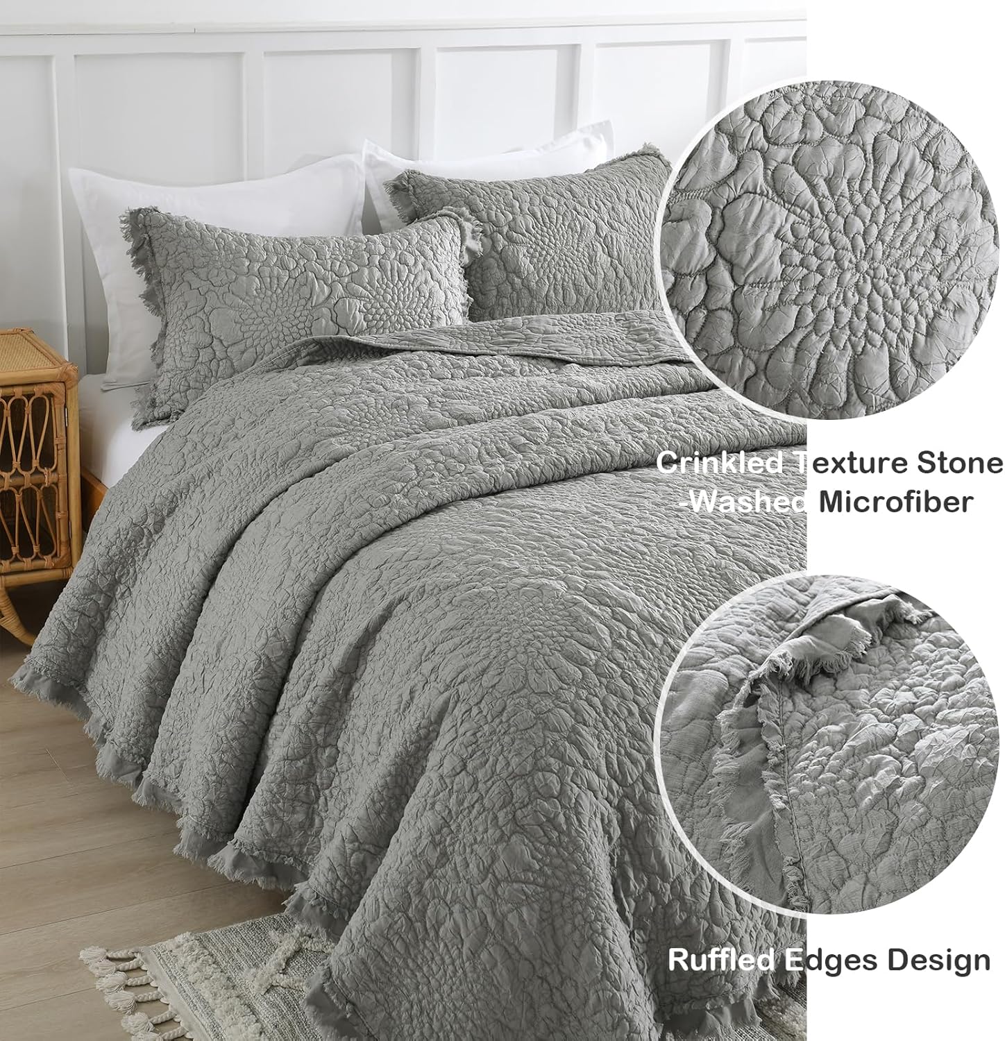 - Crinkled Texture & Stone-Washed Microfiber: This series quilt are stone-washed, which gives the fabric its soft and plush, pleasingly rumpled hand. Crinkled texture appearance add chic rustic look enhance bedroom's look.