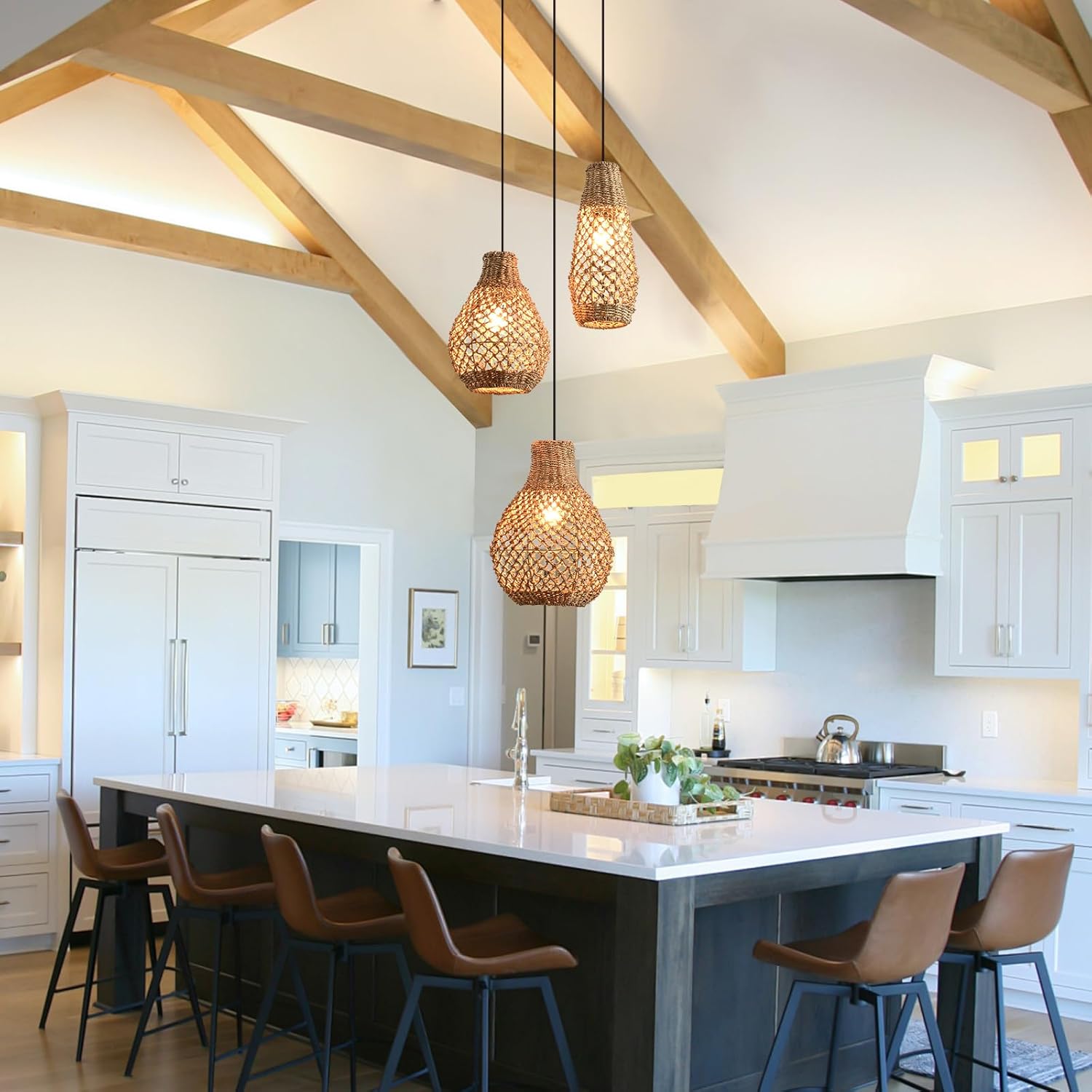 Boho Rattan Pendant Light,3 Light Coastal Woven Wicker Ceiling Hanging Farmhouse Chandelier for Kitchen Island Living Room Dining Room