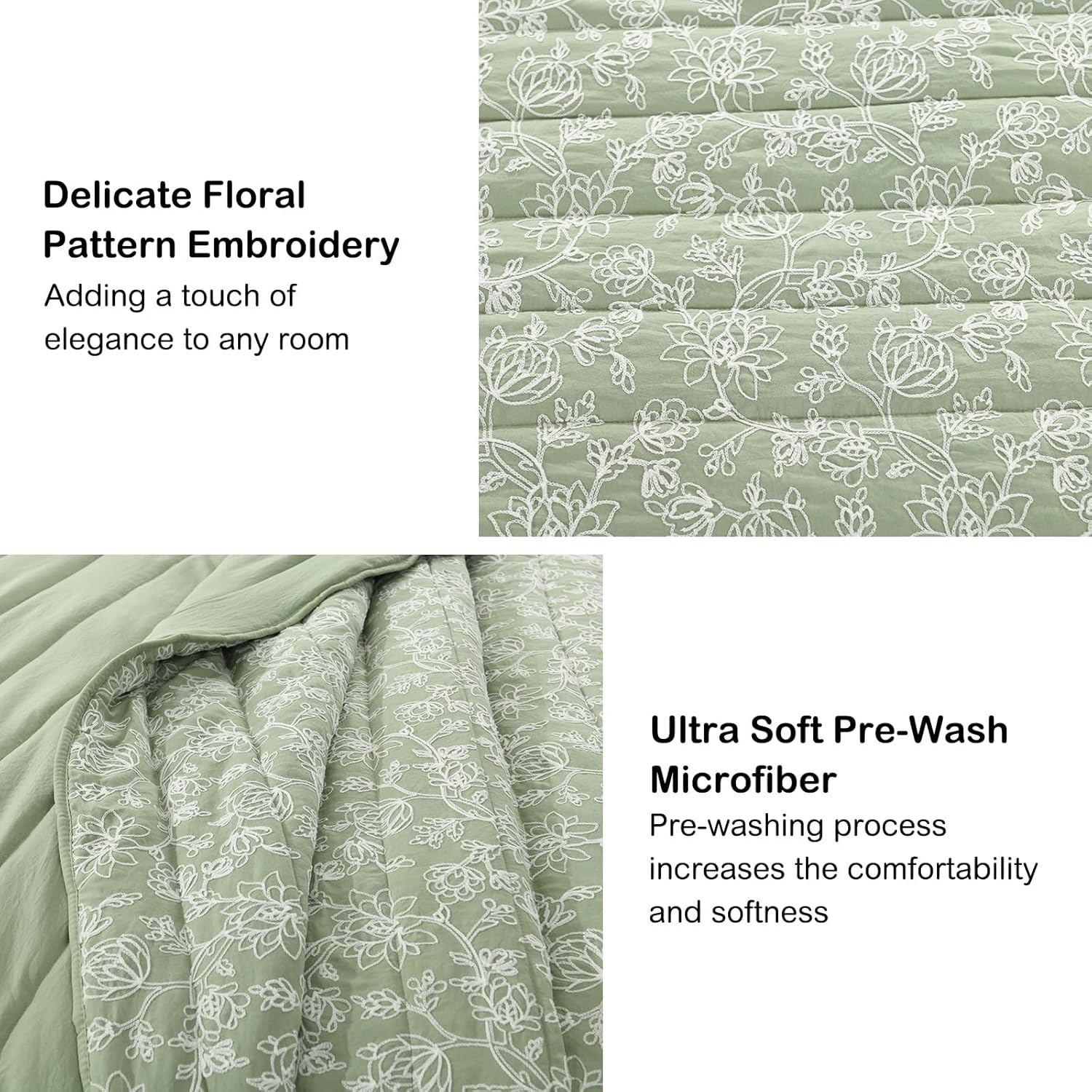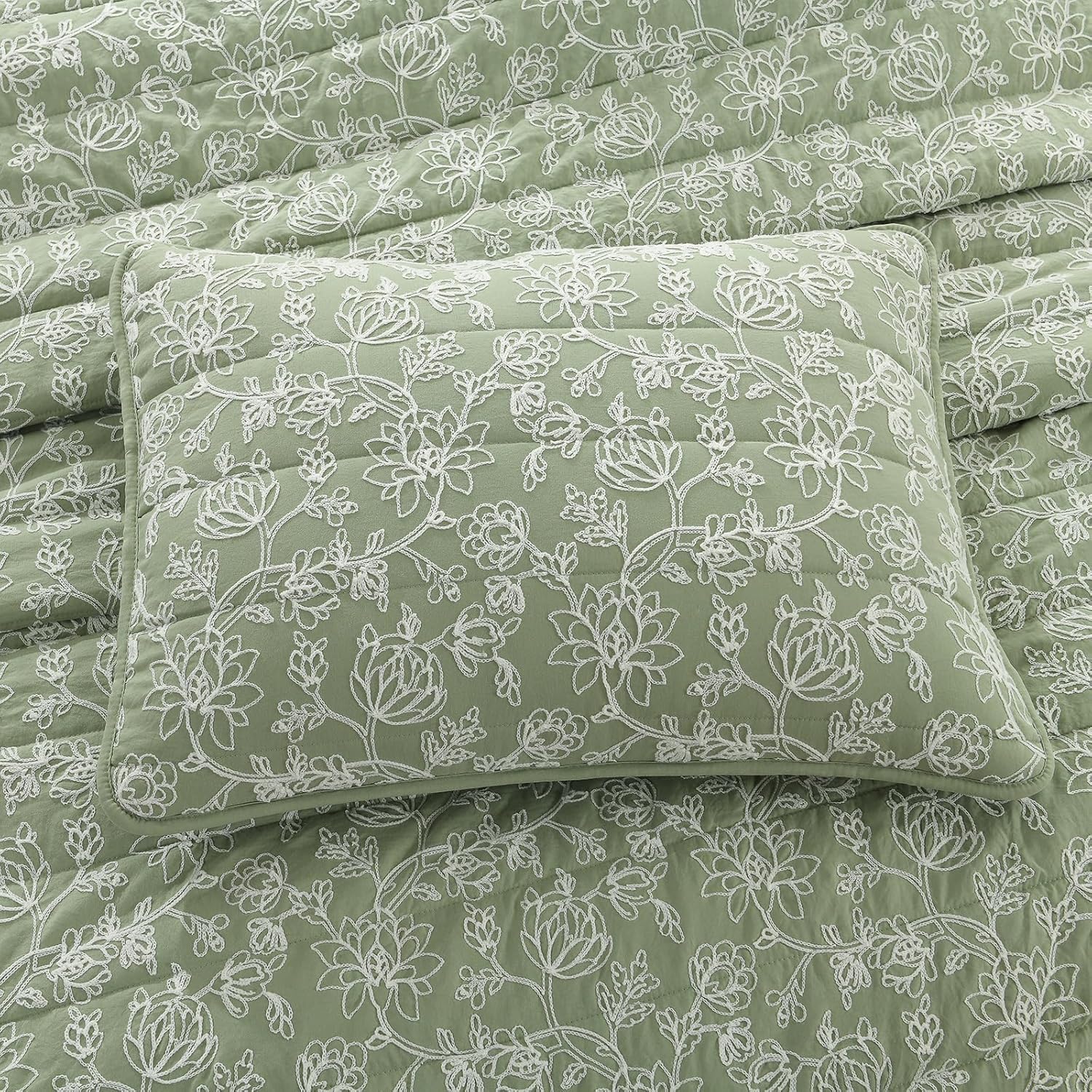 HORIMOTE HOME Floral Embroidery Quilt Queen Size, Sage Green Queen Quilt Bedding Set Soft Lightweight Bedspread Full Size Shabby Chic Farmhouse 3 Pieces Comforter Set for All Seasons