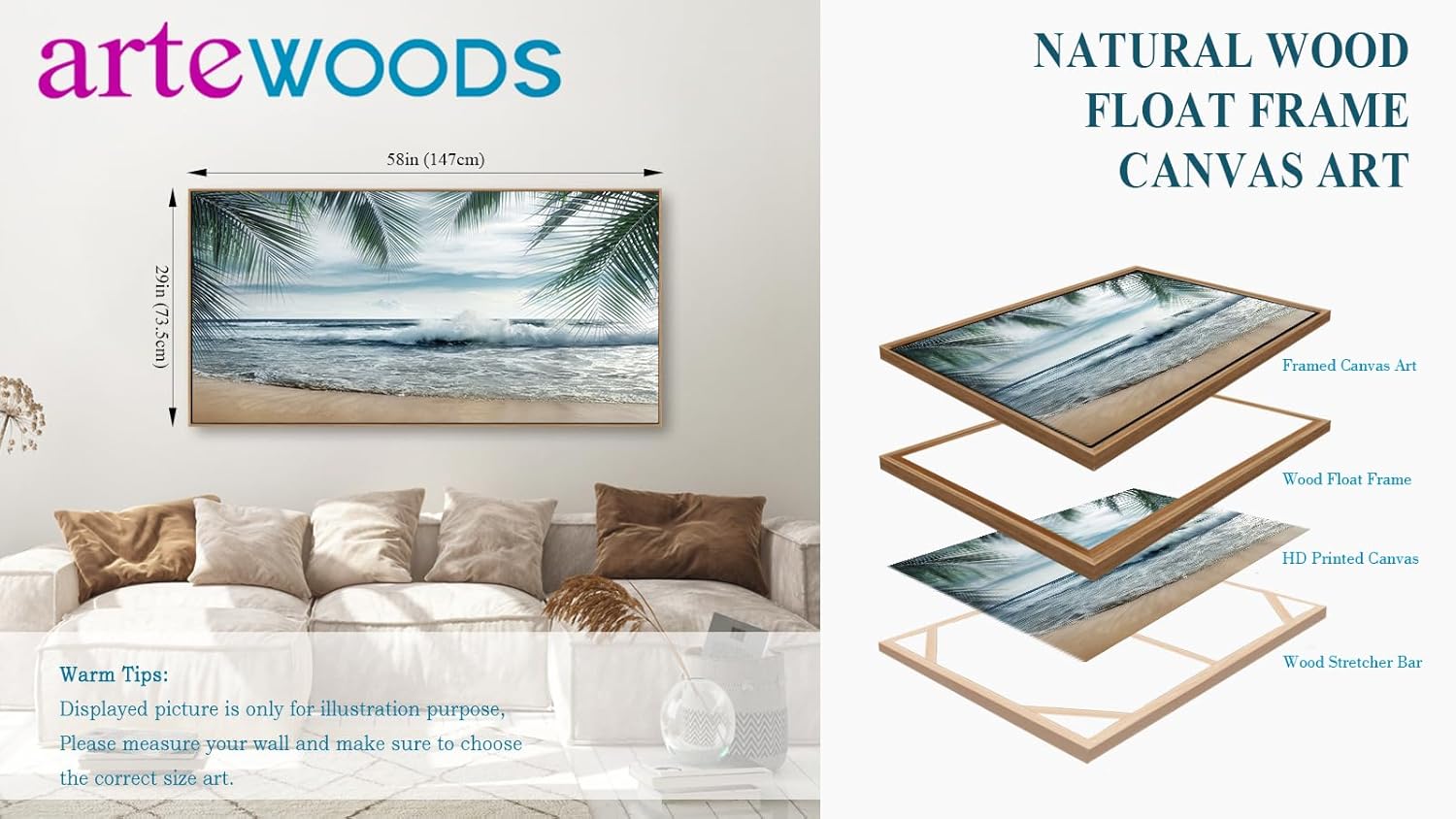 - Oceanic Retreat: Elevate your decor with this Beach Canvas Wall Art, perfect for ocean-themed decor enthusiasts. With its vivid depiction of waves, blue skies, and palm tree leaves, it transforms your space into a coastal haven, inviting you to embrace the serenity of the seaside