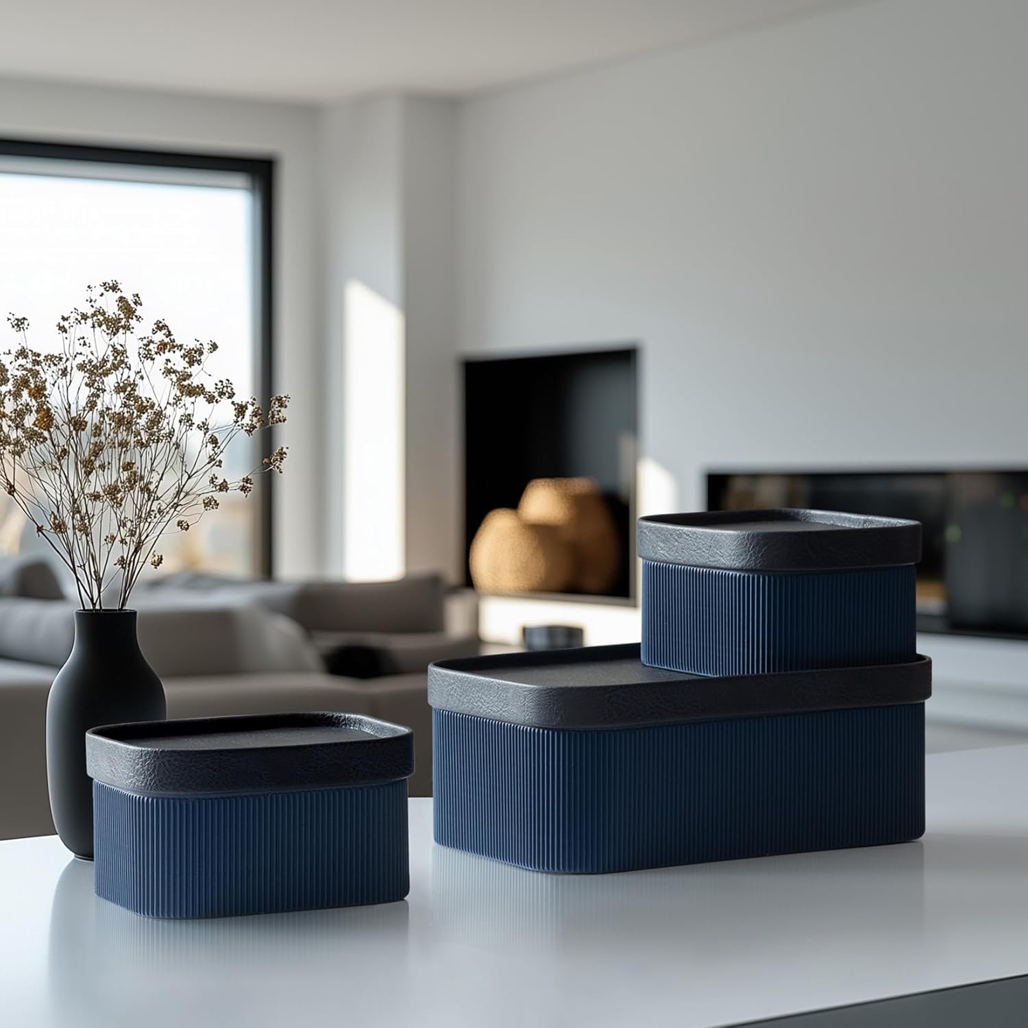 - TIMELESS STORAGE WITH A SUSTAINABLE TWIST: In a rich navy blue, this storage box set brings classic elegance and modern style to any room. With a robust MDF interior and luxurious vegan leather exterior, it's a chic, eco-friendly storage solution perfect for design-savvy spaces