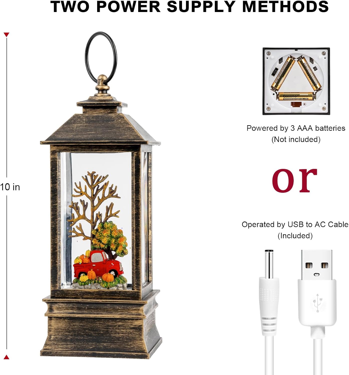 - 🍁【2 Mode Power Supply】Powered by USB to DC cable (include), the snow globe lantern can be operated without batteries, which can save you a lot on batteries. & Powered by 3 AAA batteries (not included), you can place it at any place that you want to add warm ambiance.