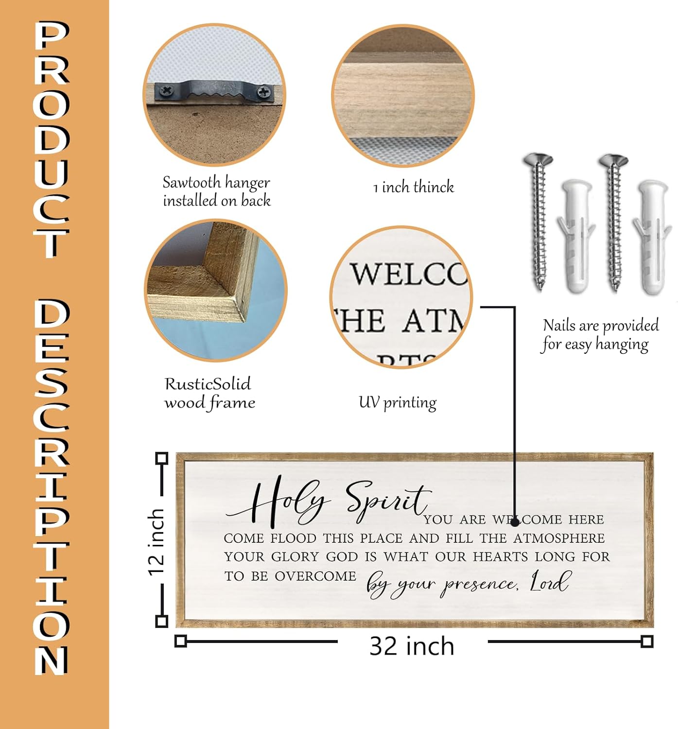 Holy Spirit You are Welcome Here Wall Decor Art 32x12 Inch Large Christian Song Bible Verse Plaque Wood Framed Sign Living Room Scripture Quote Religious For Office Wall Hanging (Wood)