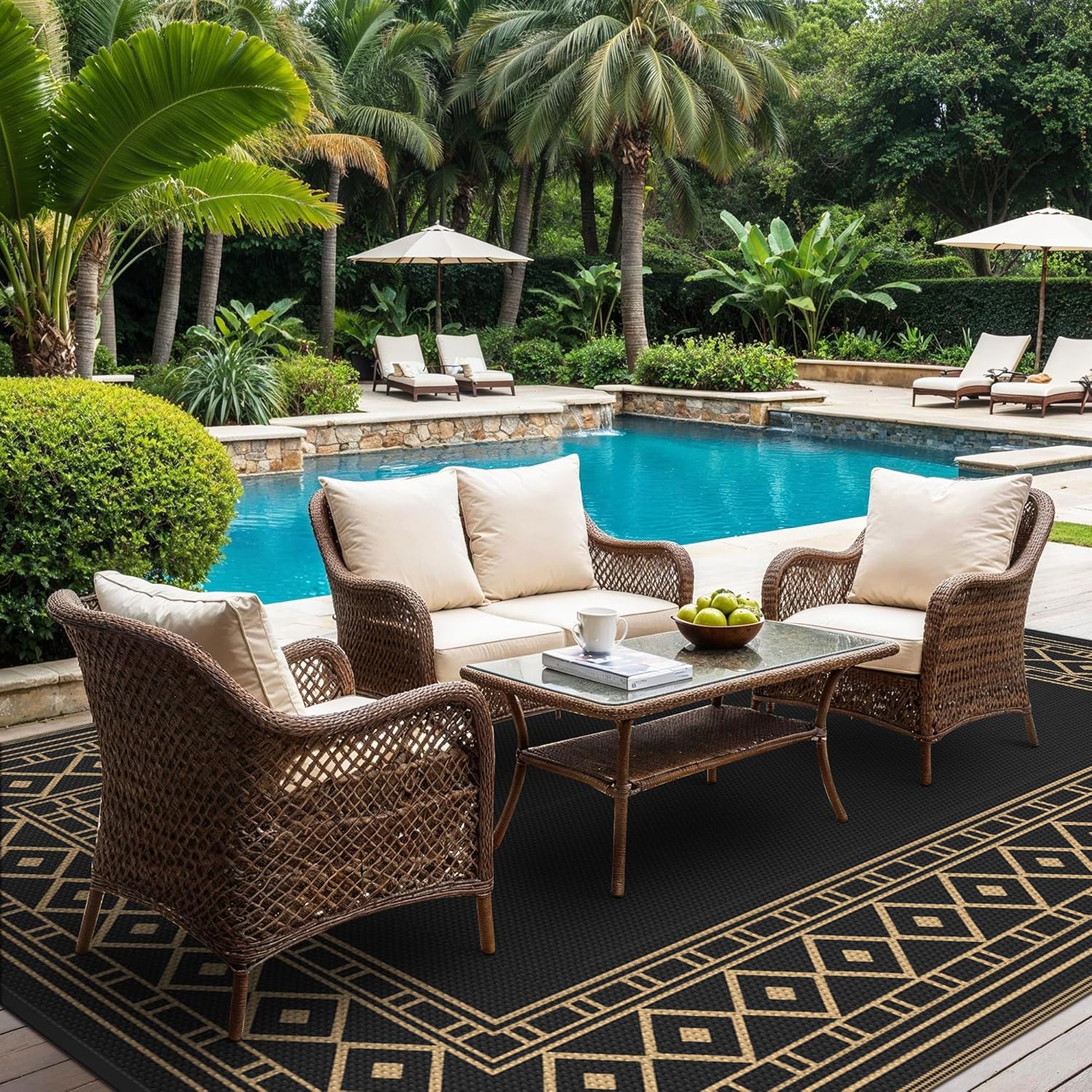 GENIMO Outdoor Rug Waterproof 9'x12' for Patio, Foldable Reversible Plastic Straw Carpet for Travel Trailers, Outside Area Mat for Rv, Deck, Picnic, Porch, Camper, Balcony, Beach, Black & Brown