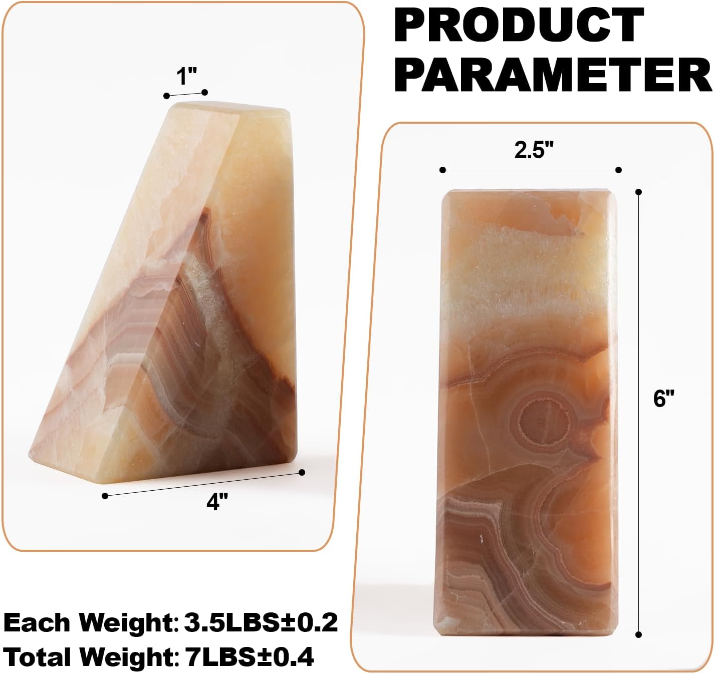 - NATURAL MATERIAL: Each bookend has a unique natural pattern. Overall product size 2.5*4*6inch. The heavy duty bookend weigh 7LB and are equipped with 4 non-slip pads to effectively minimize scratches on your desktop. Book stopper makes your reading time more relaxing and ensure the safety of you and your family with this stone bookends for shelves.