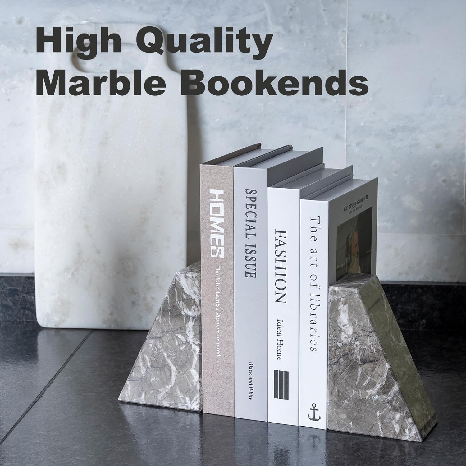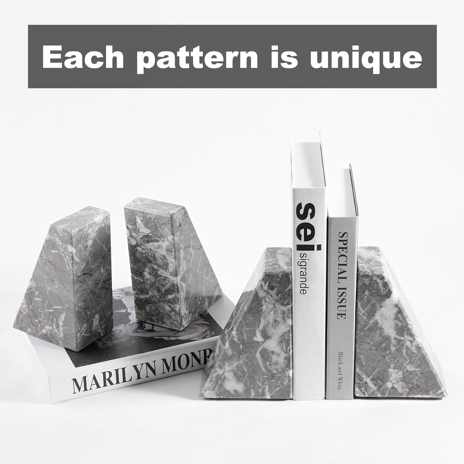 - STURDY AND DURABLE: This modern bookends for shelves is made of Morocco marble, which is as a premium building material, representing an understated but not lost attitude to life. It maintains long-term stability and will not be deformed by external factors.