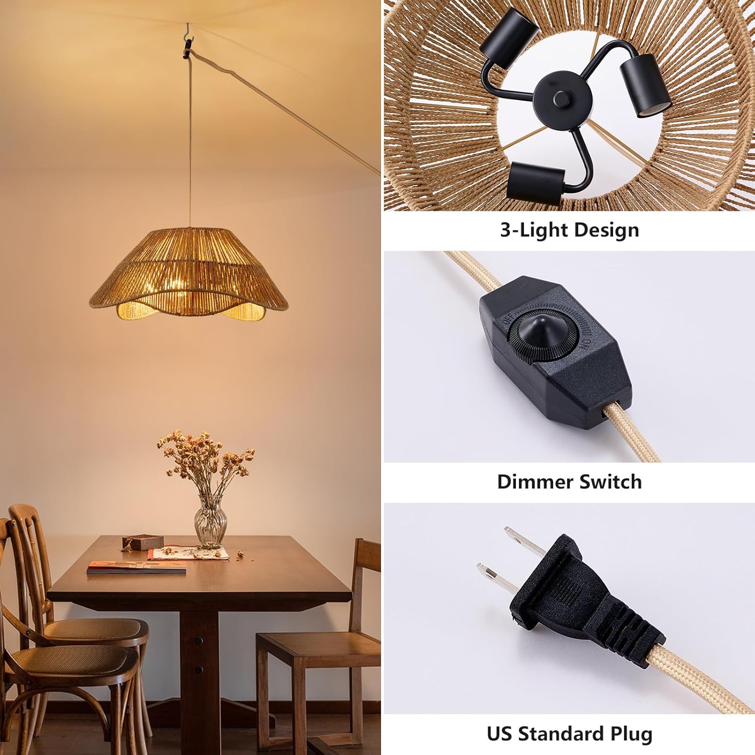 - 【Easy to Install】This plug in rattan hanging light dimmable includes all accessories and instructions for easy installation. No hard wiring is required, just hang the rattan plug in pendant light at the right height, plug it into a wall outlet and turn dimmer button.