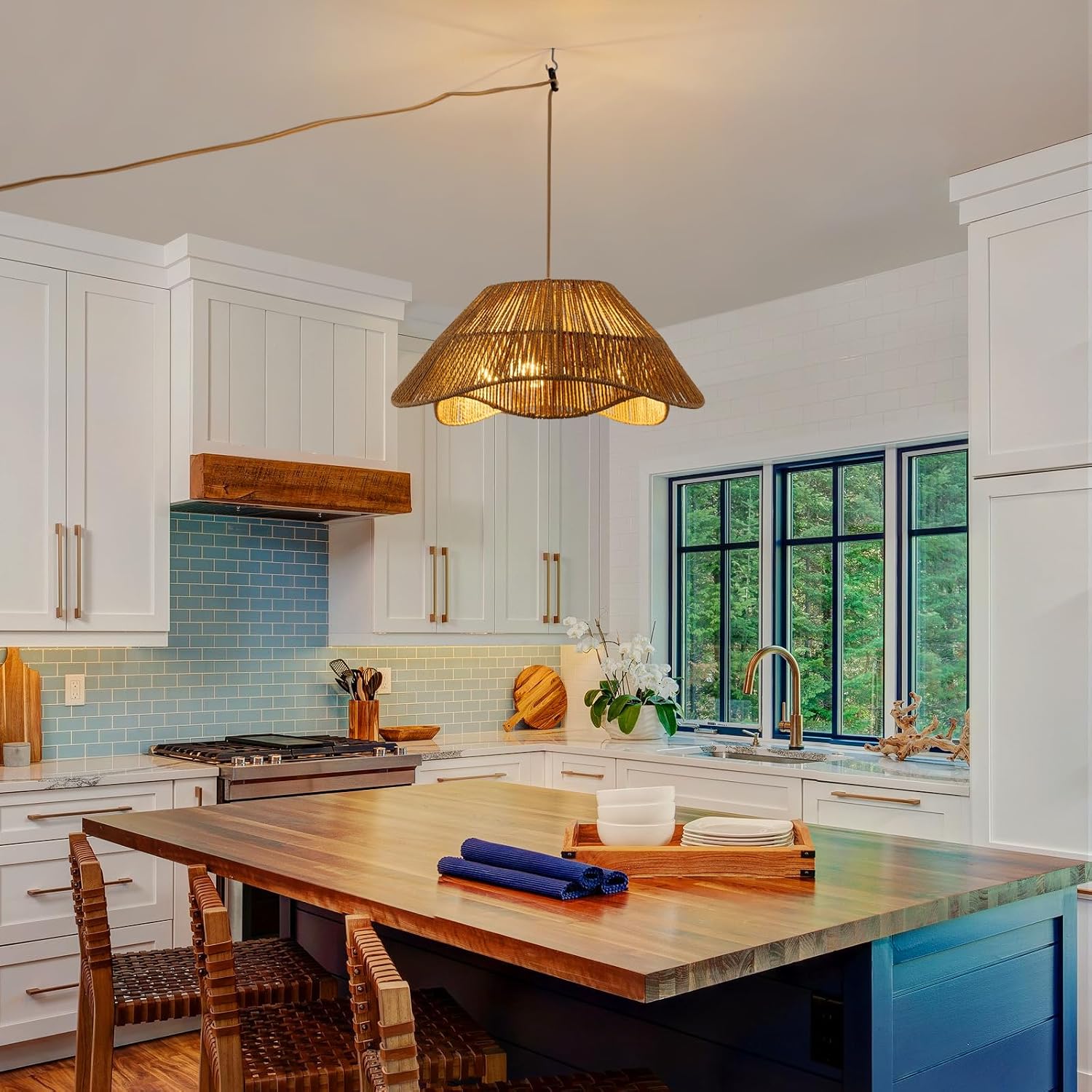 - 【Unique Design】Crafted from hand-woven natural rattan and durable metal, the plug-in pendant light blends farmhouse and boho styles to complement your indoor and outdoor decor. The double irregular rattan design diffuses light evenly and casting petal-like shadows on the ceiling, creating a warm and inviting ambiance.