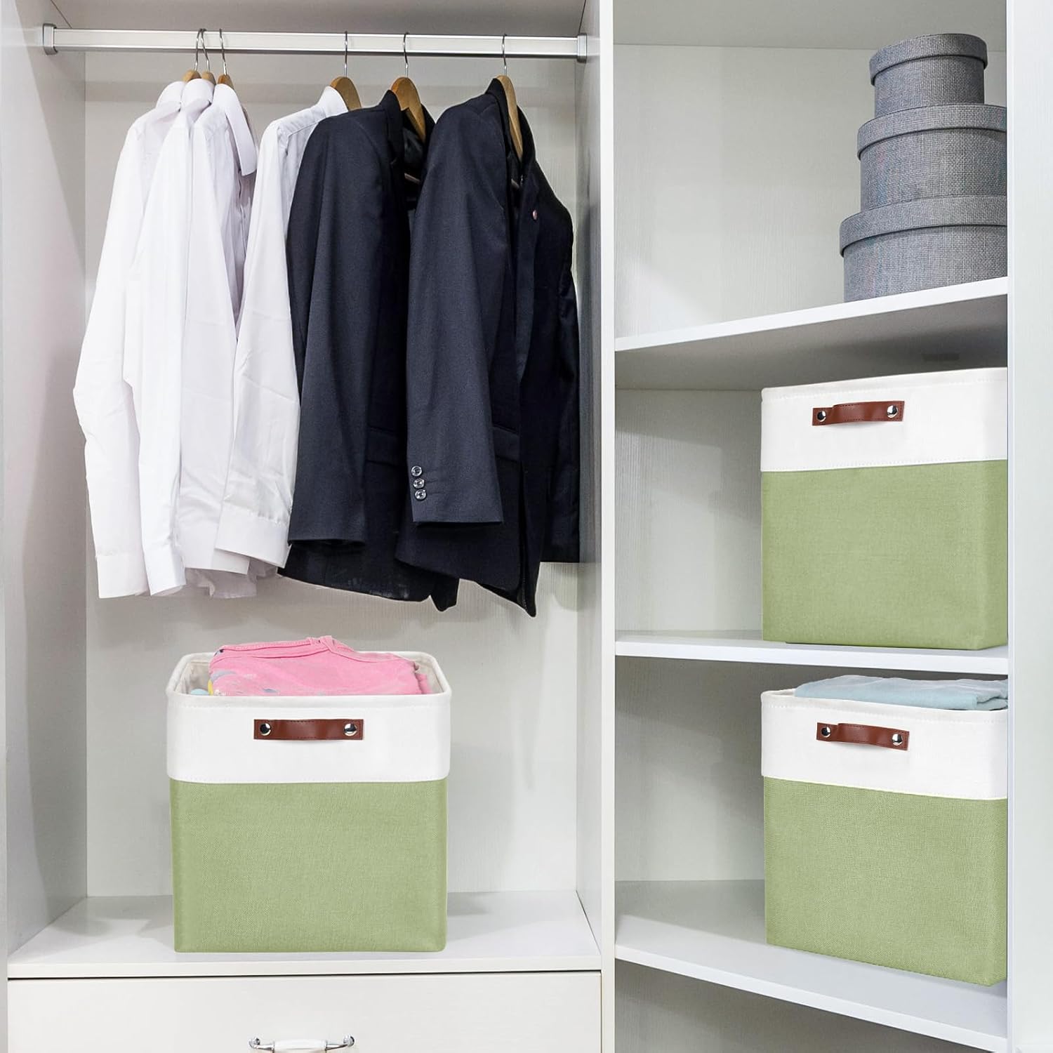 - 【Premium Quality】 - The closet organizer outside fabric is made of durable and attractive linen & thicken Environmental EVA, and used a lining material for the inside, handmade stitched. The sturdy metal rod frame around the top and 2.5mm MDF board in the bottom help to keep the storage bins in shape and provide max weight capacity up to 30lb. The sturdy leather handles make it easy to carry or pull off and out of shelves.