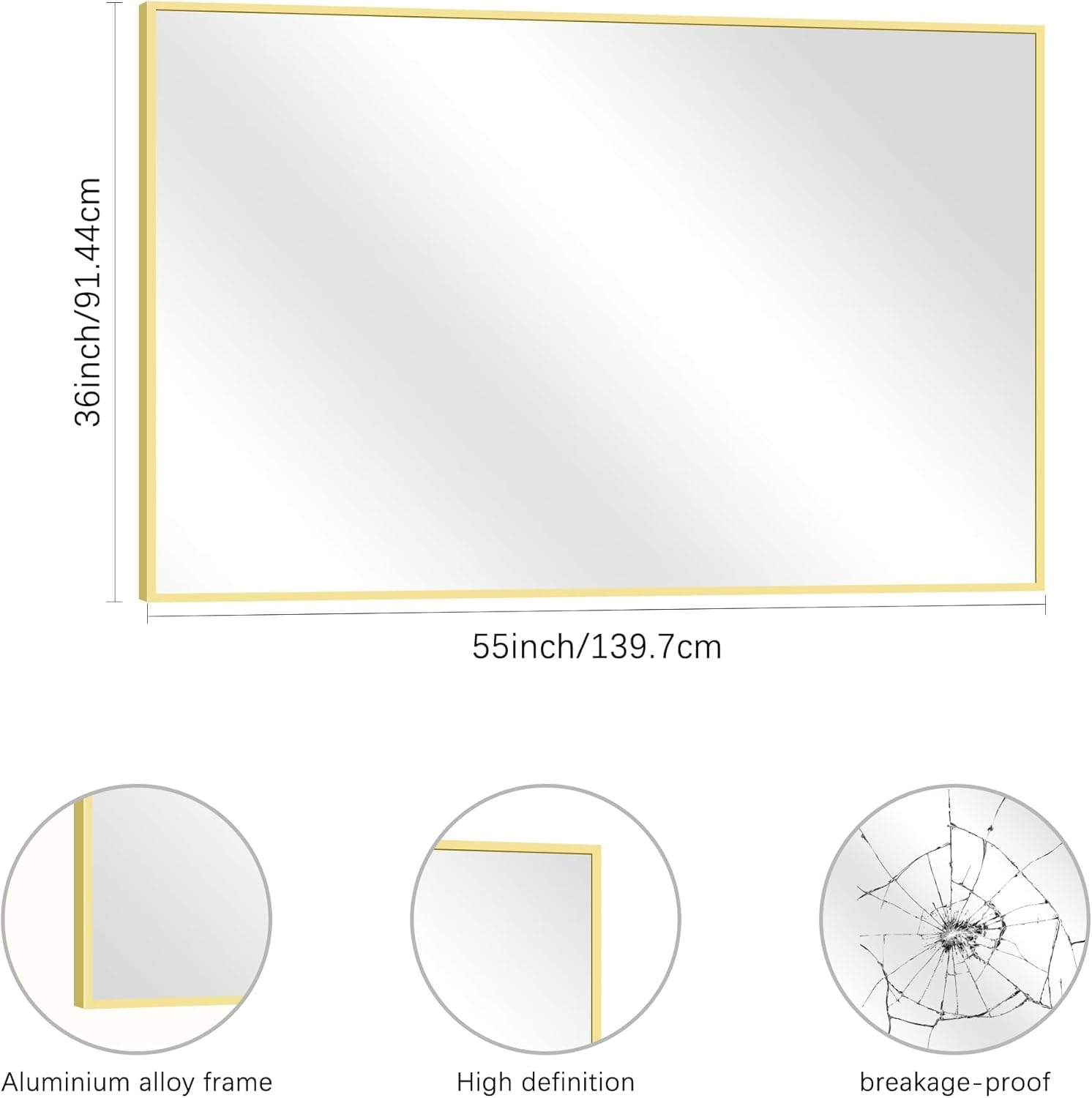 - DURABLE FRAME: Bathroom wall mirror frame is aluminum alloy frame,with good moisture resistance,anti-corrosion and sturdy. Gold classic color will provide your room with unique decoration to help you modernize room.