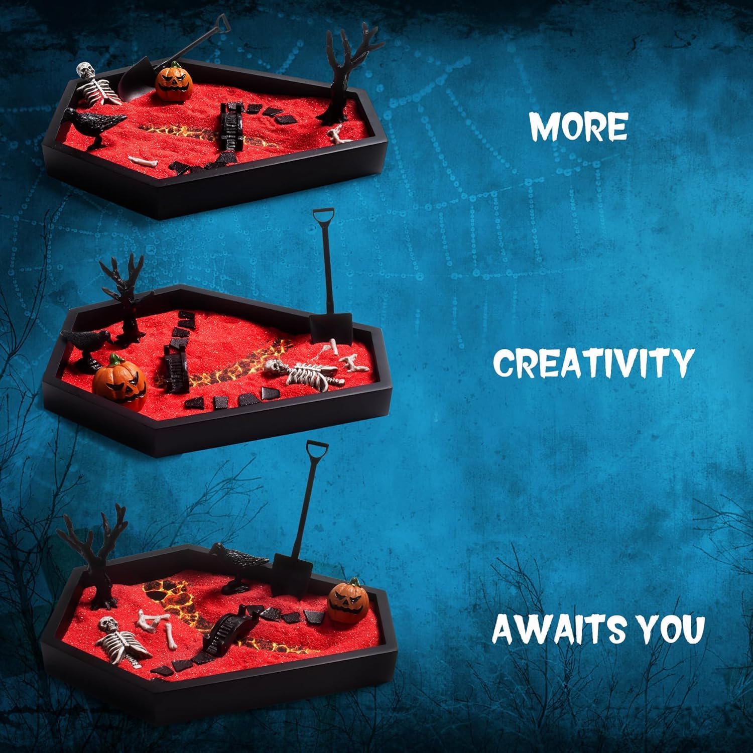 - π DIY: Our Halloween Coffin Zen Garden is designed to resemble a traditional coffin.This product has 9 accessories including 1 Gothic coffin tray, 1 bridge, 1 bag of red sand, several pieces of molten rock, crows, a shovel, a dead tree, a half skeleton, and a base image of molten rock. On the special holiday of Halloween, you can place your imagined hell world, the intersection of life and death, and so on in any corner of your home to present the atmosphere of Halloween you want. Any artistic conception you want to express can be created by yourself.