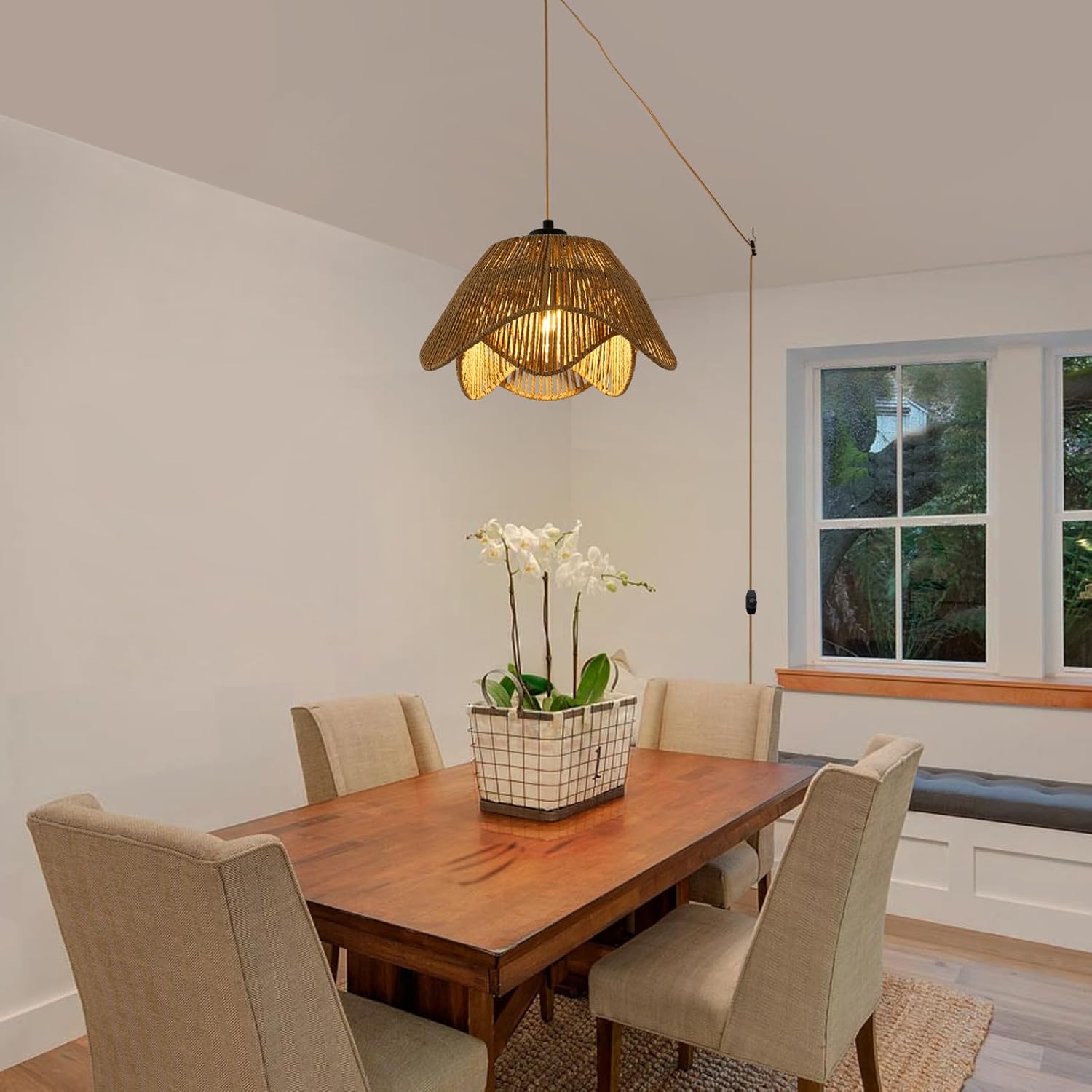 - 【Rattan Plug In Pendant Light】Comprised of a hand-woven rattan shade and a 14.76 ft dimming plug cord, this plug in hanging light is lightweight and easy to install, making it easy to bring a touch of bohemian chic to your space. The light diffuses soft light and beautiful shadows through the rattan shade, creating a cosy and warm atmosphere.